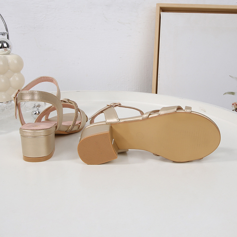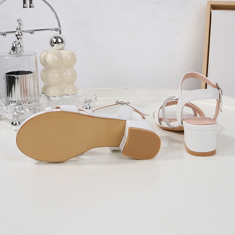 在庫あり+フレンチスタイルのラインストーンサンダル2025夏クリスタルチャンキーヒールスリッポンワンピースに合わせやすいハイヒールラインストーン