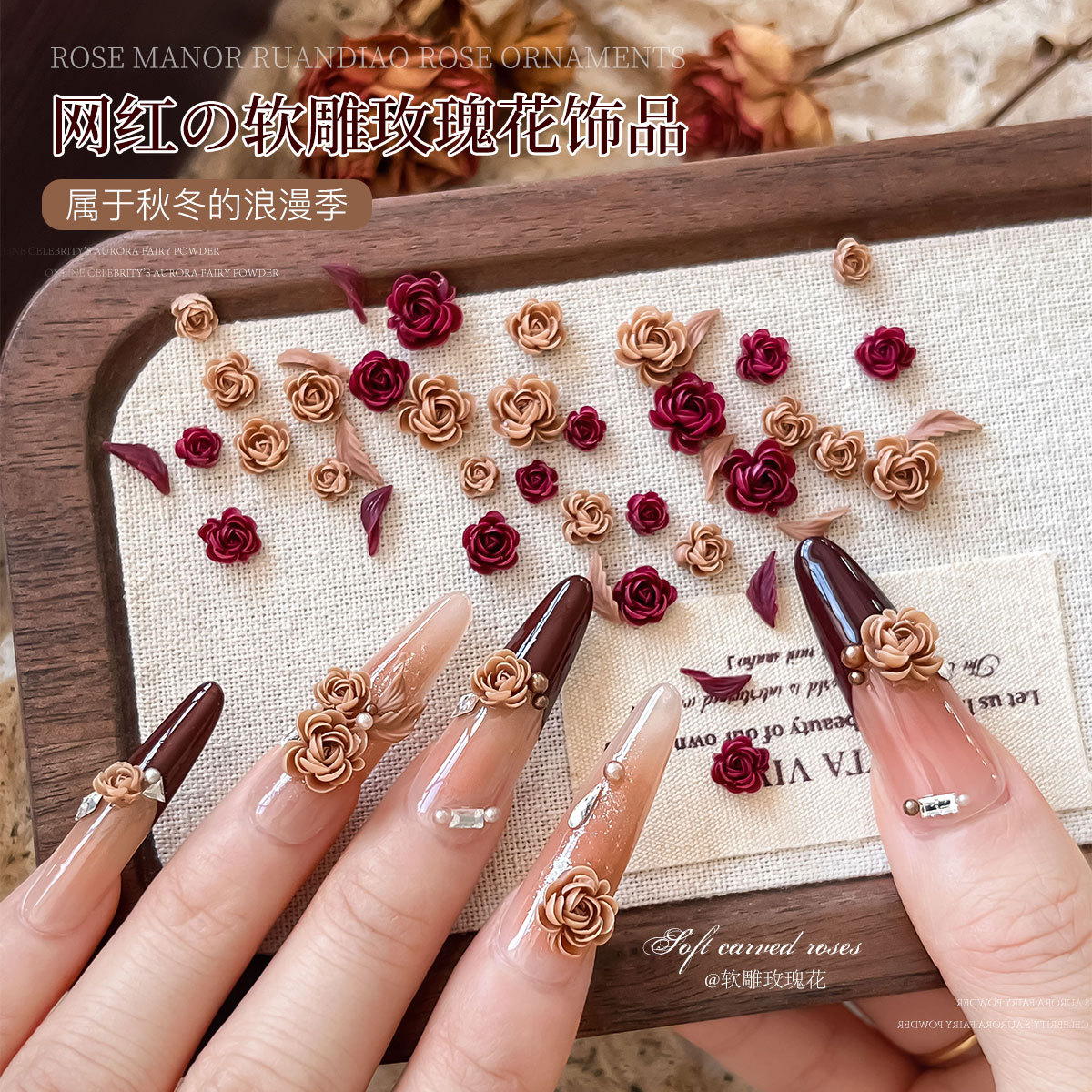 网红软雕玫瑰花美甲饰品秋冬显白红色立体混装山茶花指甲饰品批发