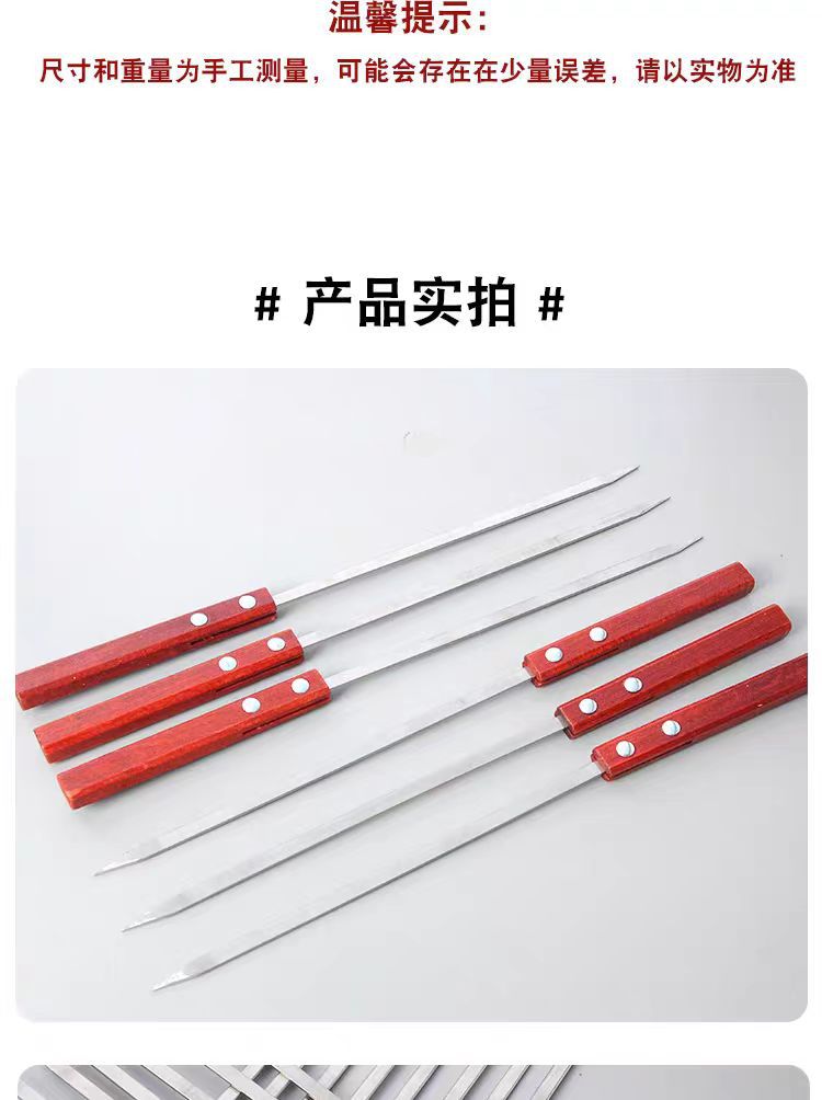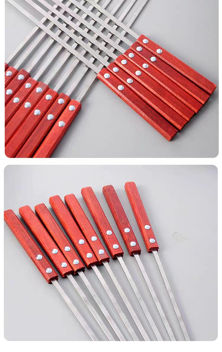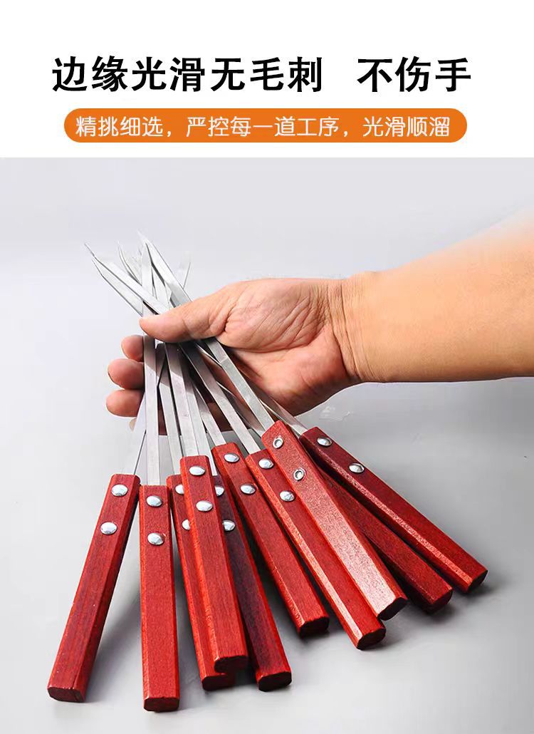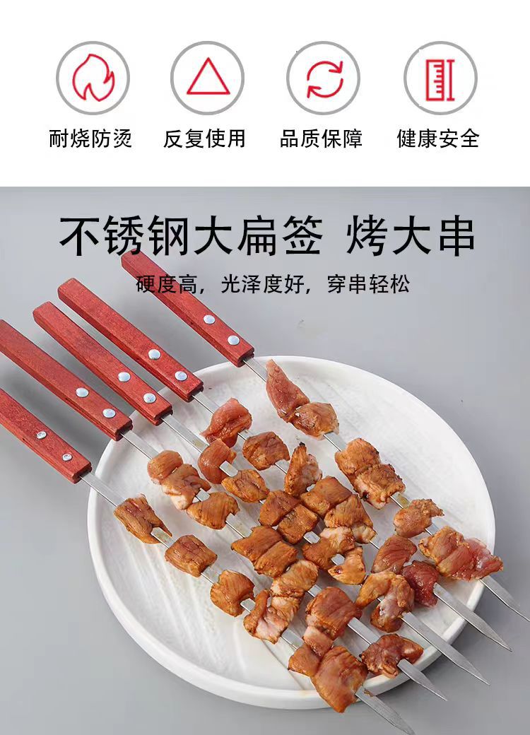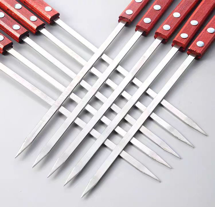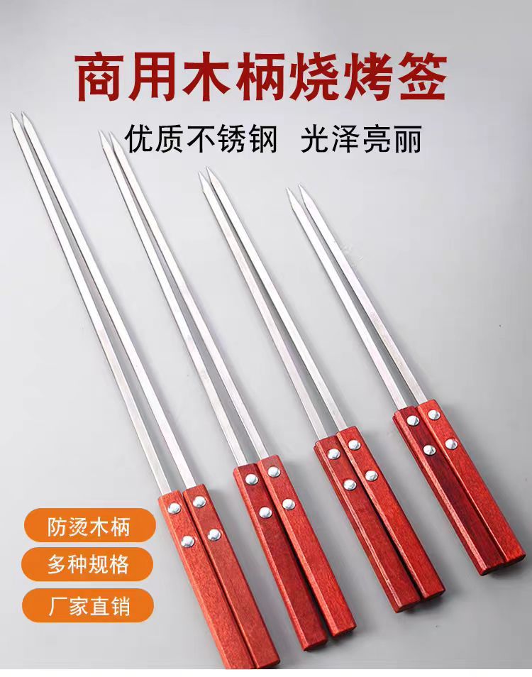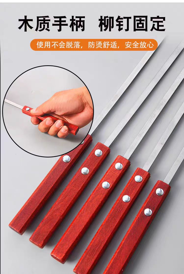 卸売304 # 木製ハンドル付きステンレス鋼バーベキュースティック、角型ハンドル、大きな油付き串、平串、新疆バーベキュー、東北バーベキュー