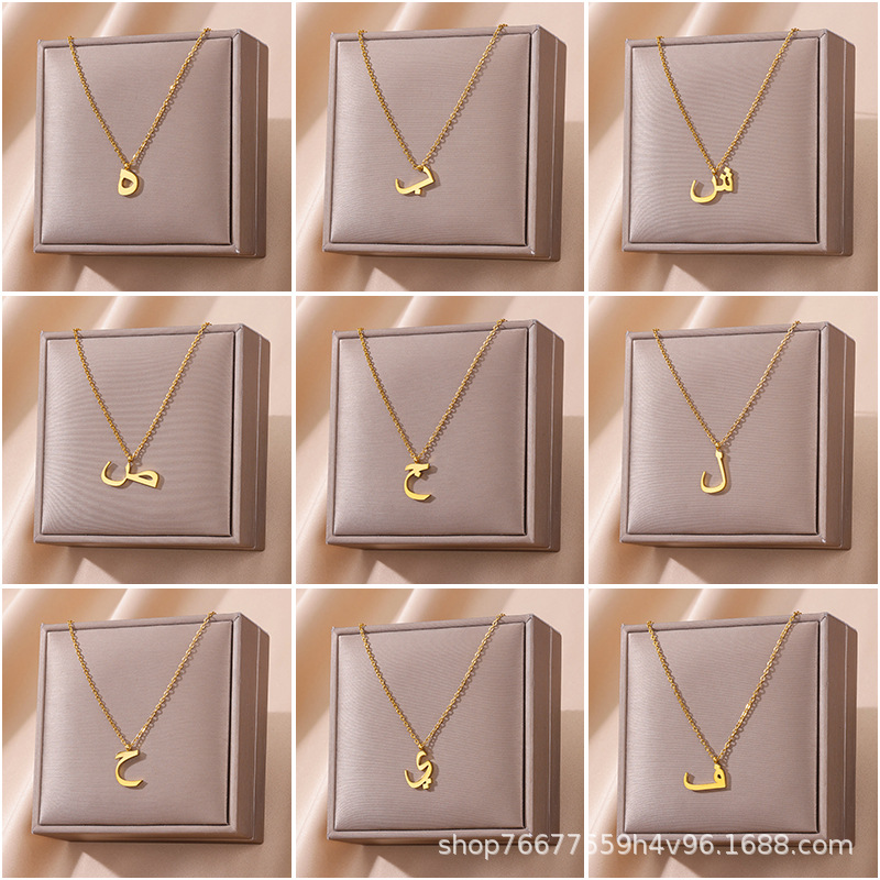 ステンレス製アラビア文字28文字ネックレス レディース鎖骨チェーン ゴールドチタン鋼カット光沢ペンダント