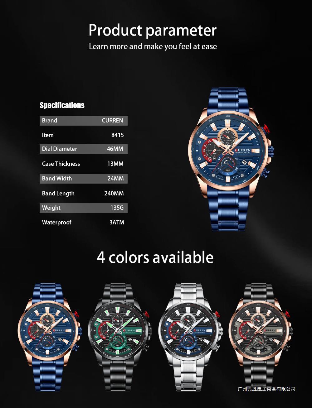 Currenカレン8415男性ビジネススチールベルト腕時計石英カレンダー六針多機能クリエイティブ男性腕時計