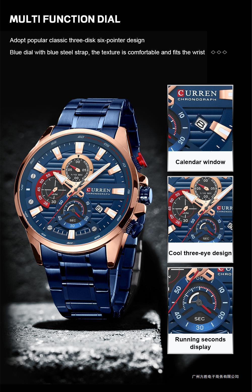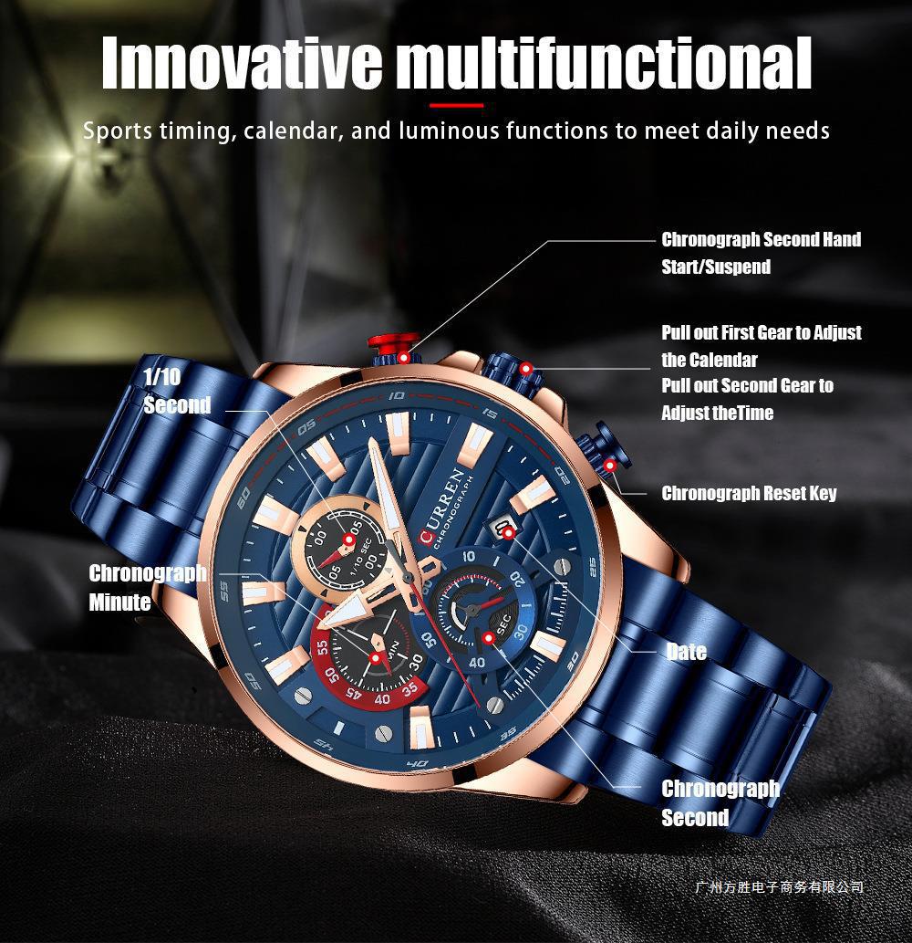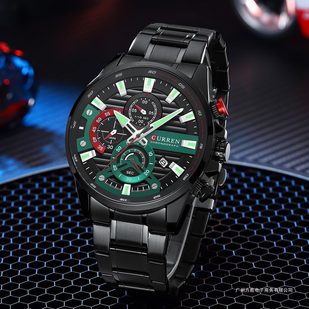 Currenカレン男性カレンダー腕時計防水大皿鋼帯男性時計多機能真六針石英腕時計