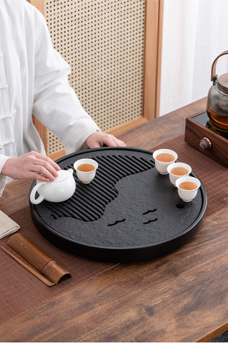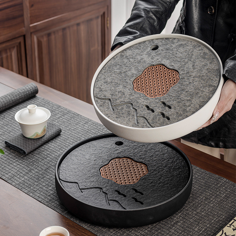 円形烏金石陶磁器茶盤家庭用2025新型中国式乾泡台小型軽豪華茶海貯水茶托