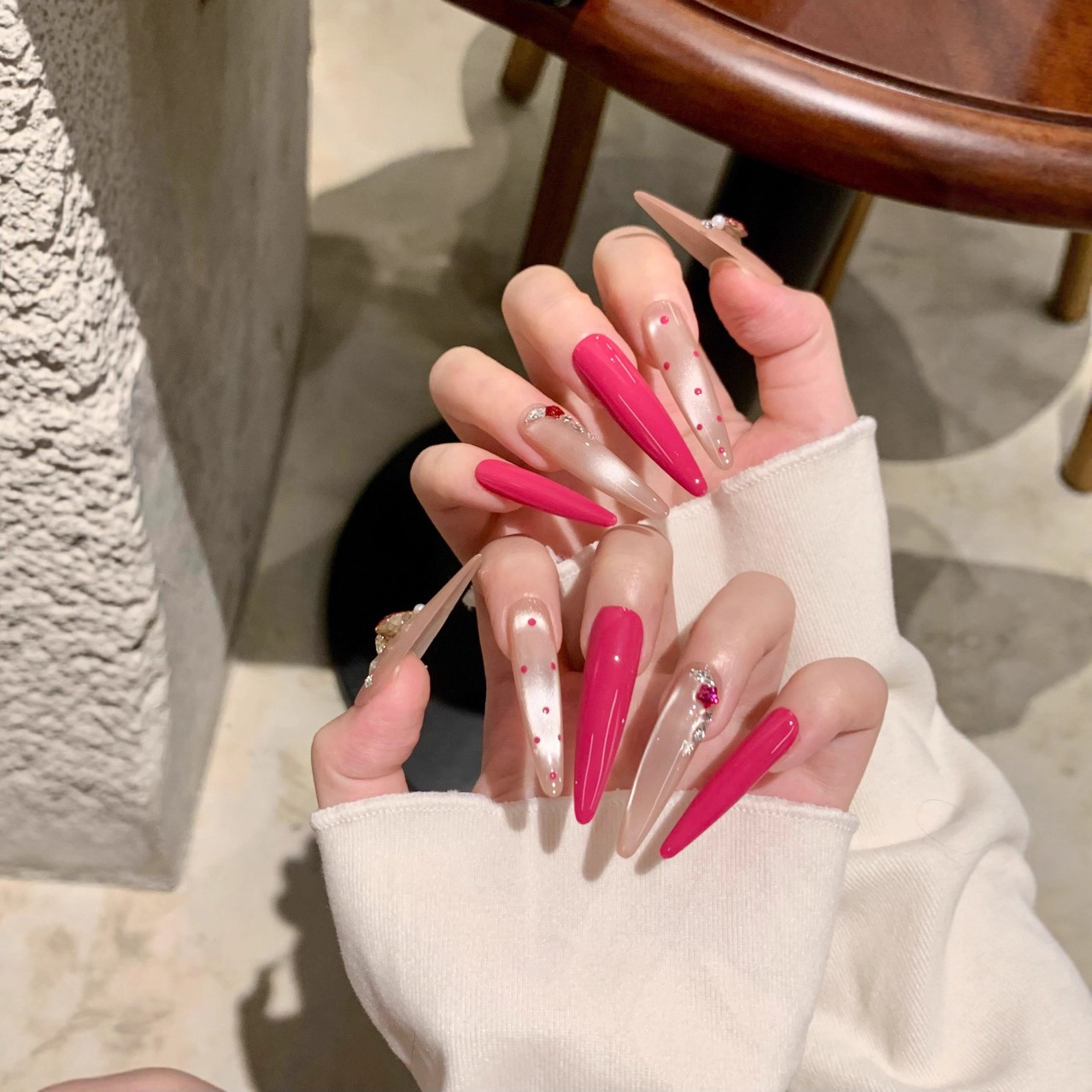 【草莓啵啵】纯手工穿戴甲批发辣妹芭比玫红渐变波点美甲甲片