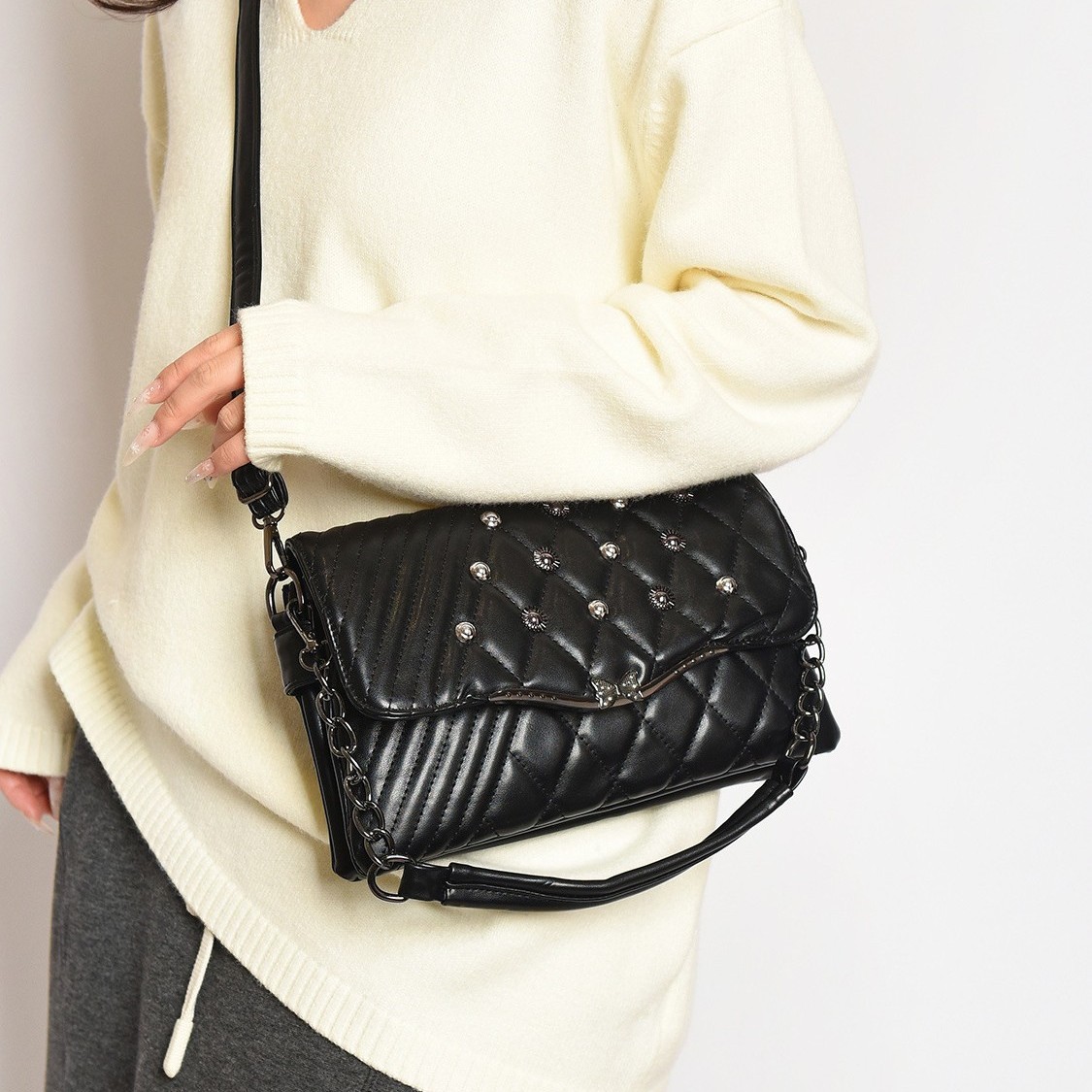国境を越えた新型の斜めショルダー菱格中年ファッション気質