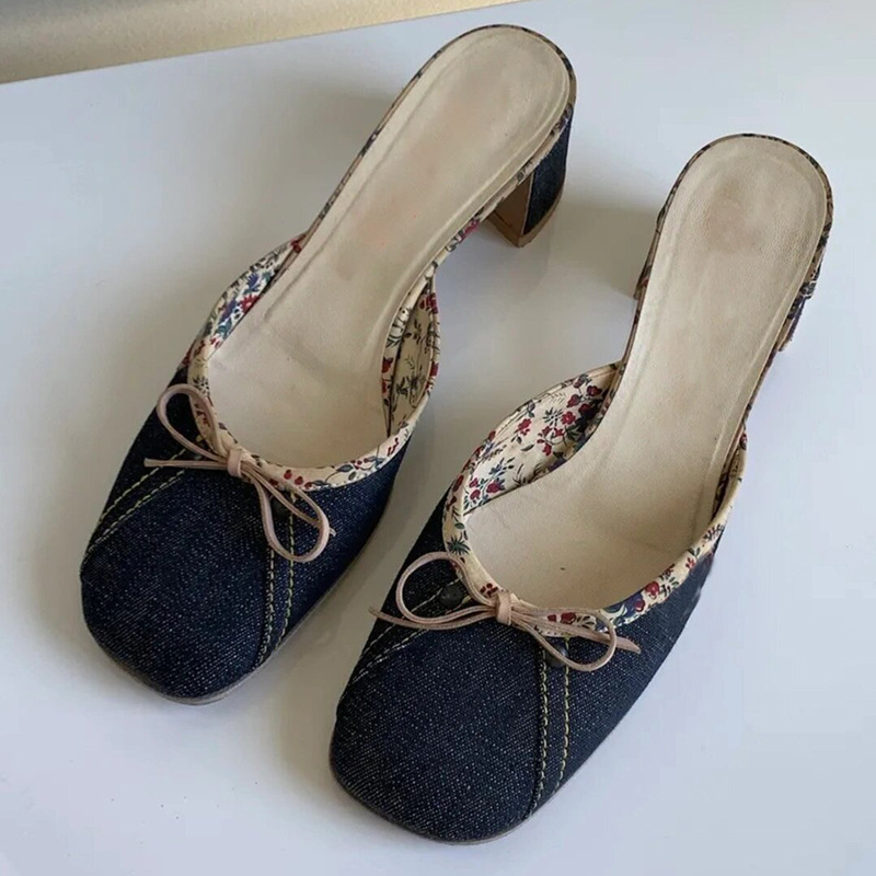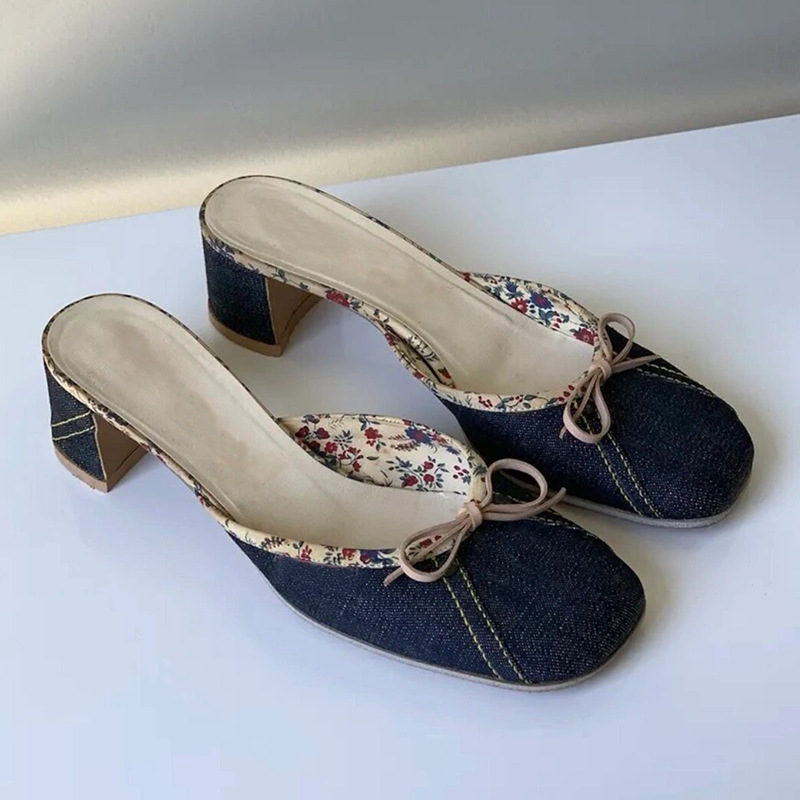 ニッチなアイテム!!韓国製レディースデニムサンダル、スクエアトゥ、蝶結び、チャンキーヒール、ハイヒール(税抜)