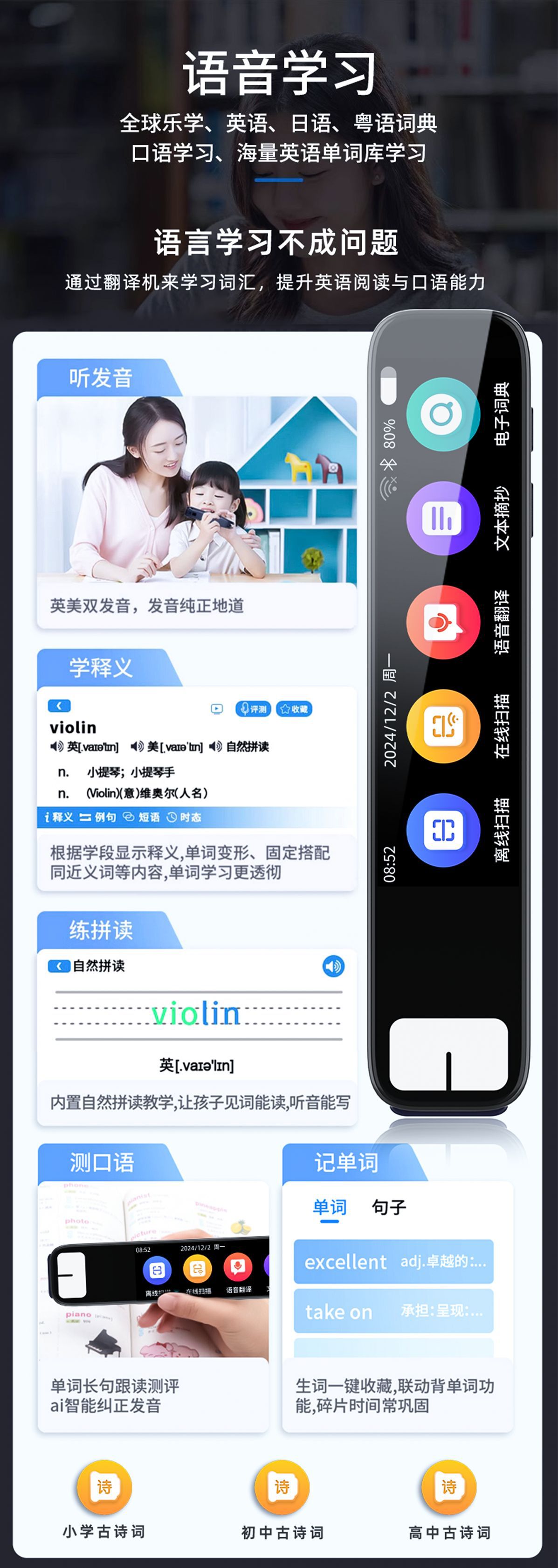 多機能三合一学習ペン、リスニングツール、全科目対応、小学校・中学校・高校向け、スキャンして問題を解く、携帯型