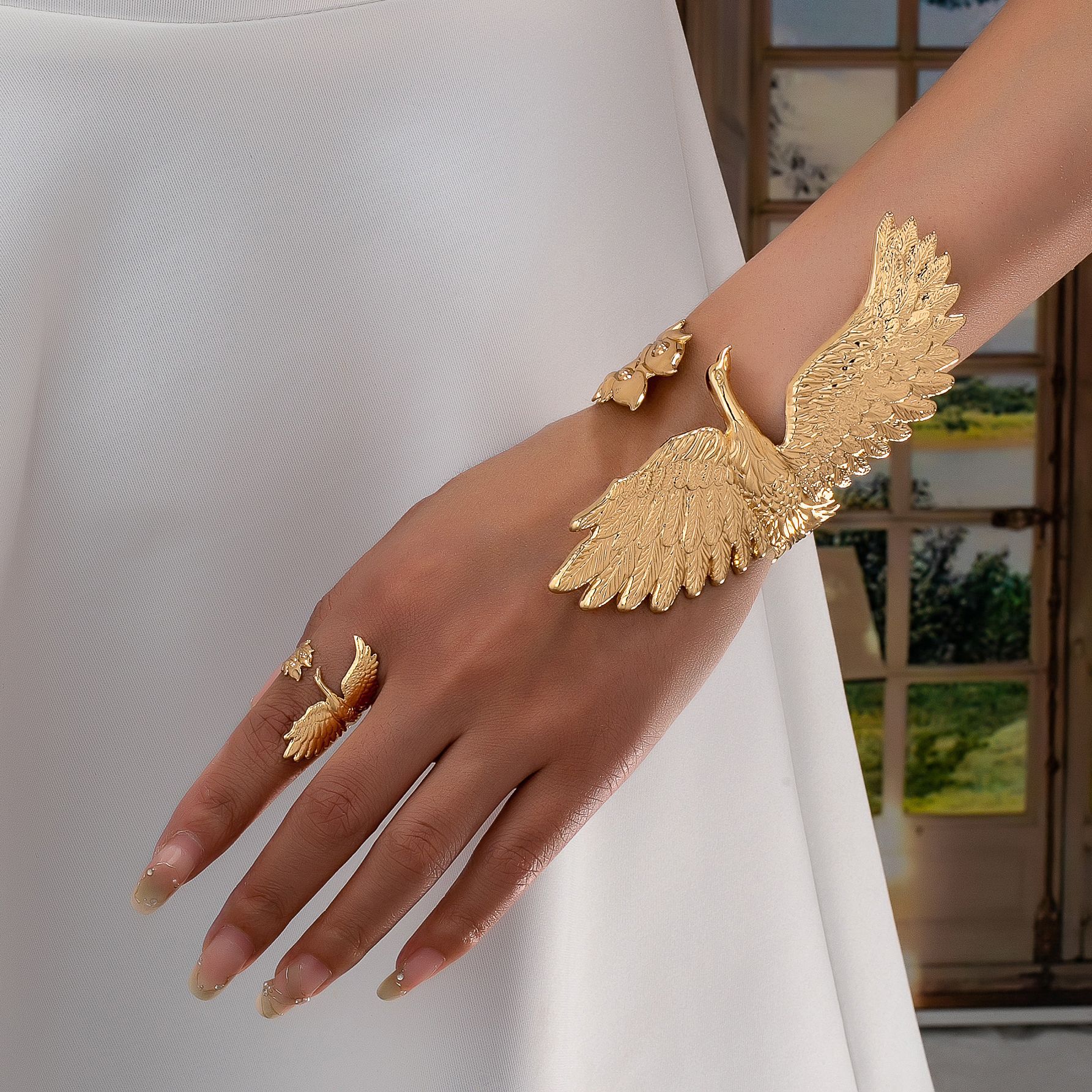 跨境热卖个性夸张创意凤凰手镯戒指套装适合女士街头派对佩戴