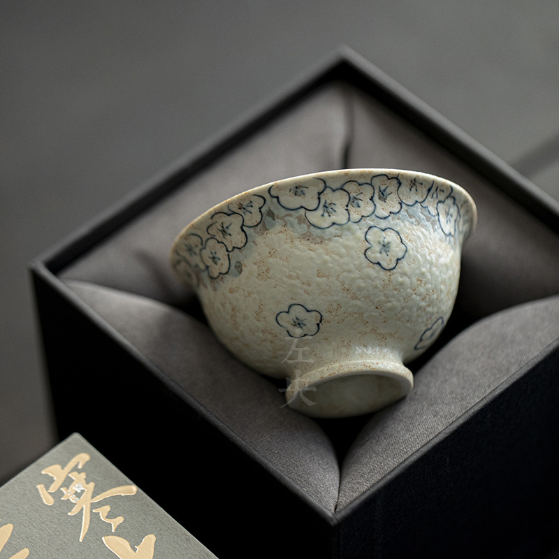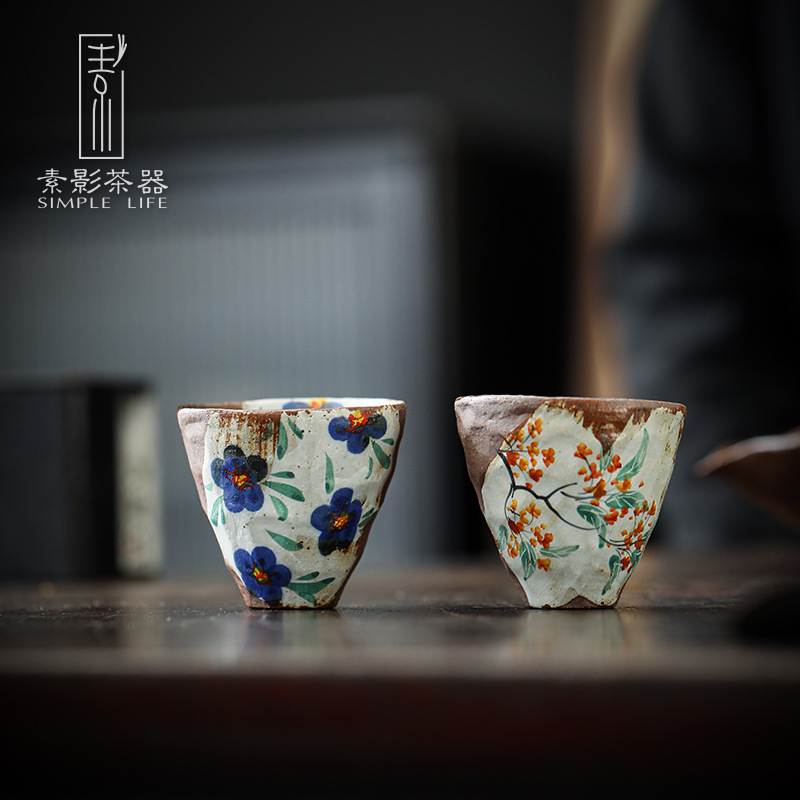 素影手描き老岩泥茶杯復古粗陶品茗杯柴焼工夫茶具創意日本式主人杯