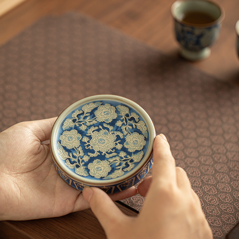 中国式模造青花蓋置手技茶道杯托陶磁器開片レトロ杯托茶壺蓋置茶杯