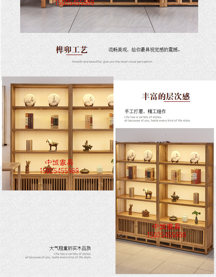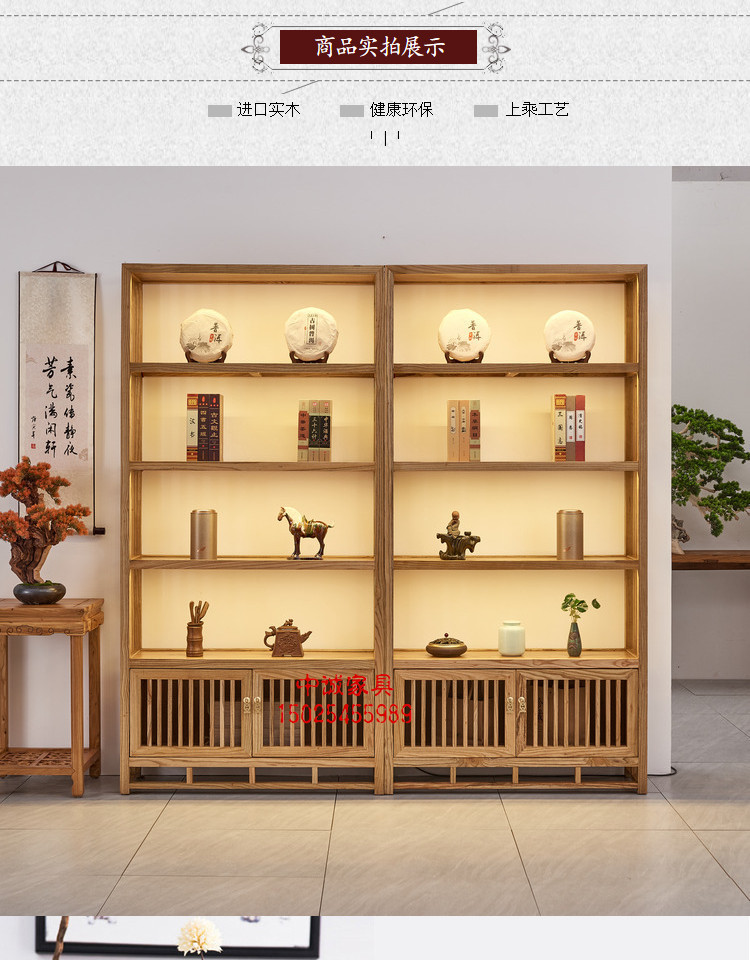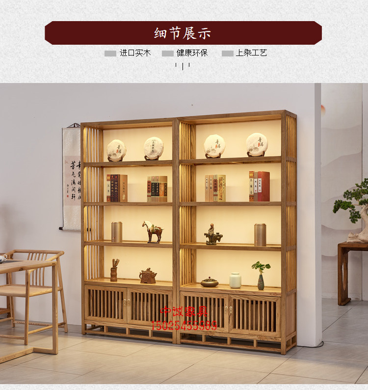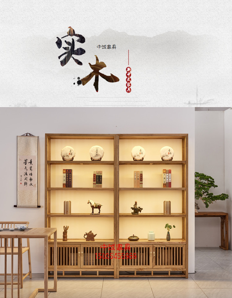 無垢材の本棚、古美術品棚、茶道具、茶室の展示棚、禅意のある中国風の陳列棚、茶葉の棚