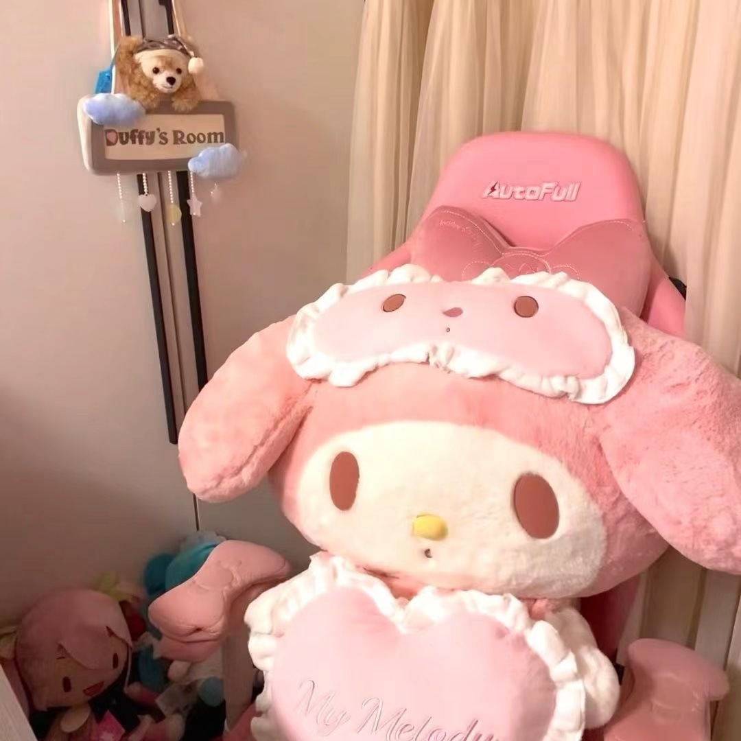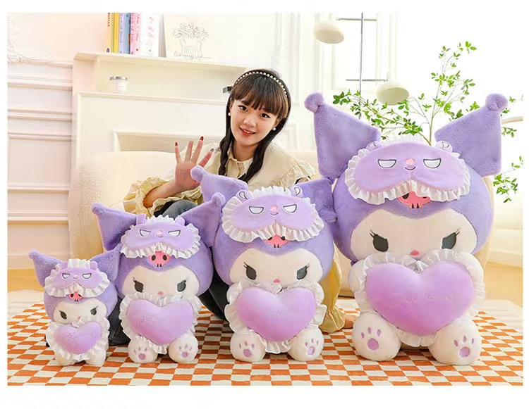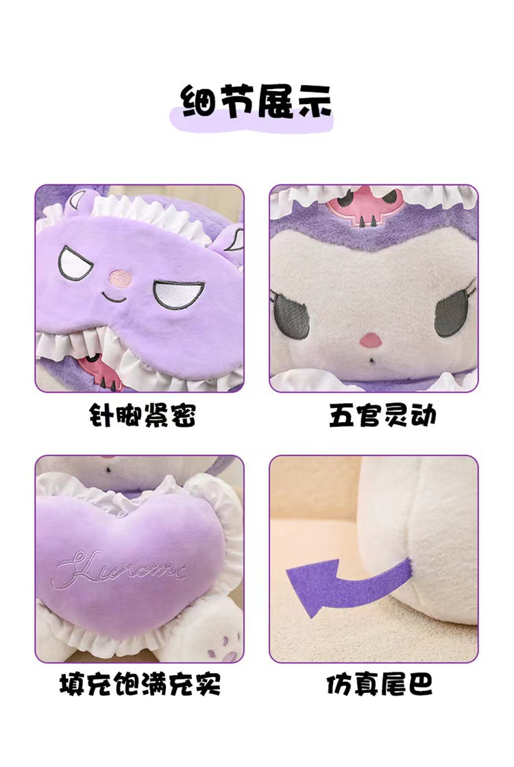 国境を越えた愛のクロミ公仔の女の子が寝ている枕を抱いてアイマスクをします。