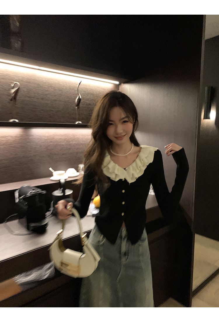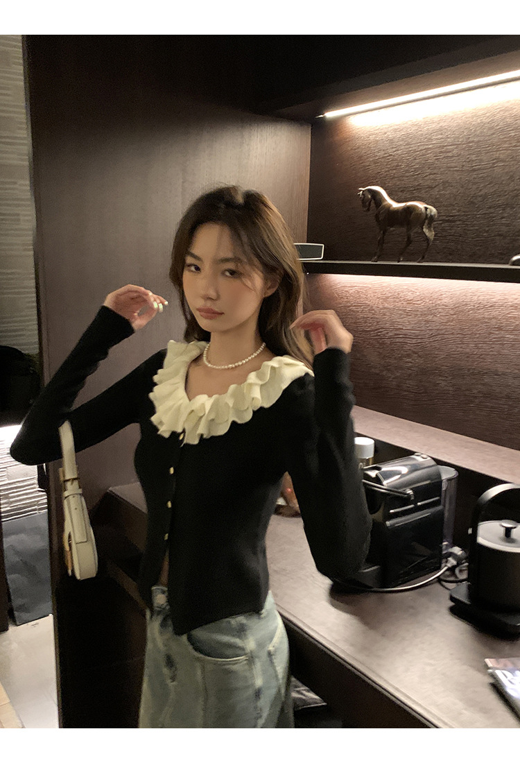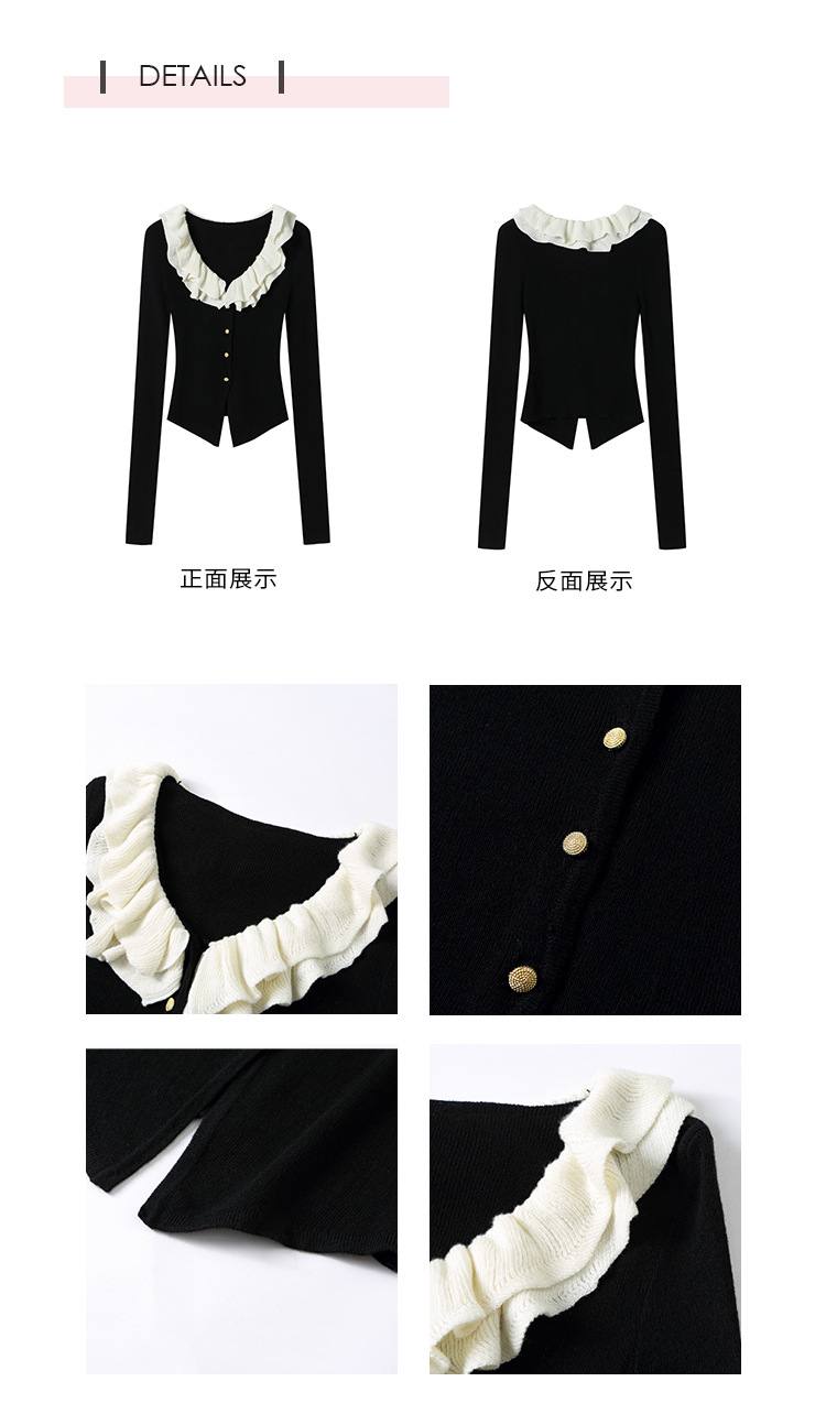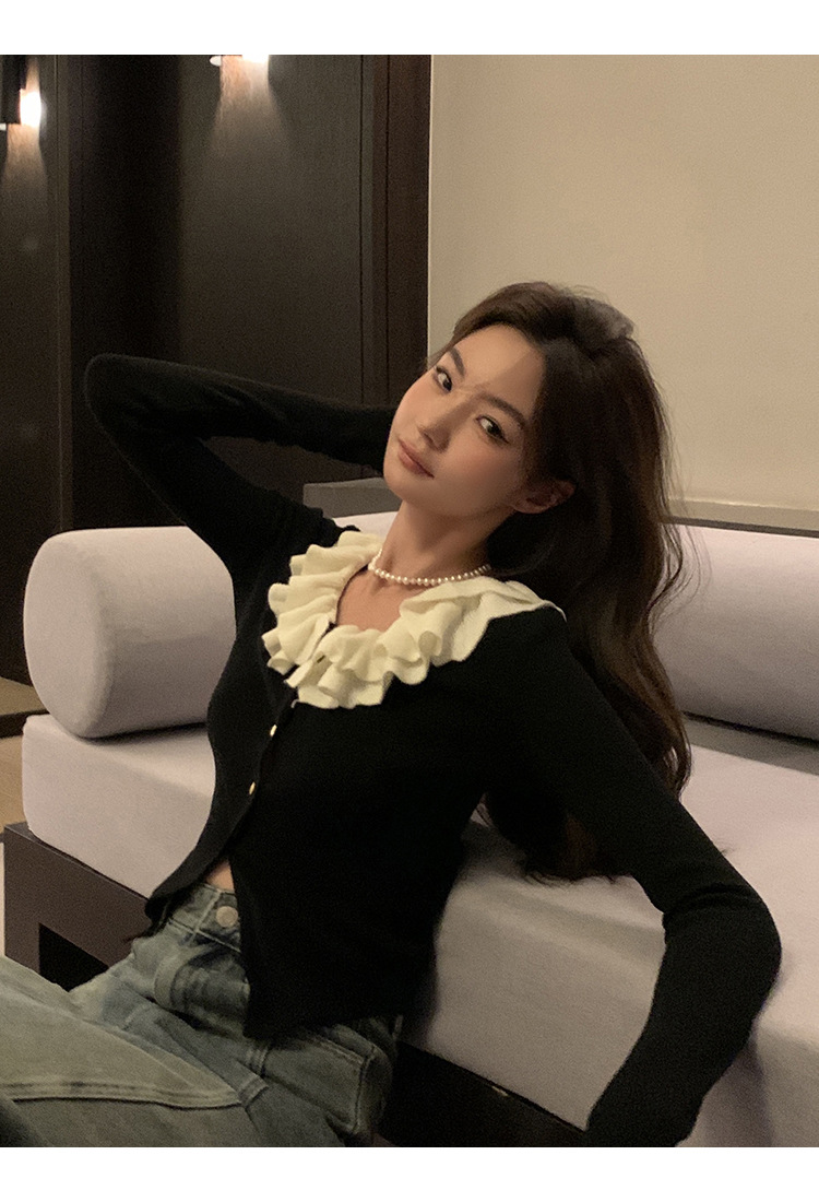 ソリッドカラーフリルカラー黒長袖多用途痩身スプライシング初秋シックなデザインの女性用ショートセーター
