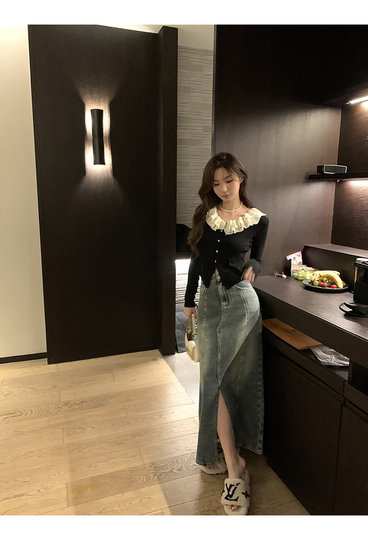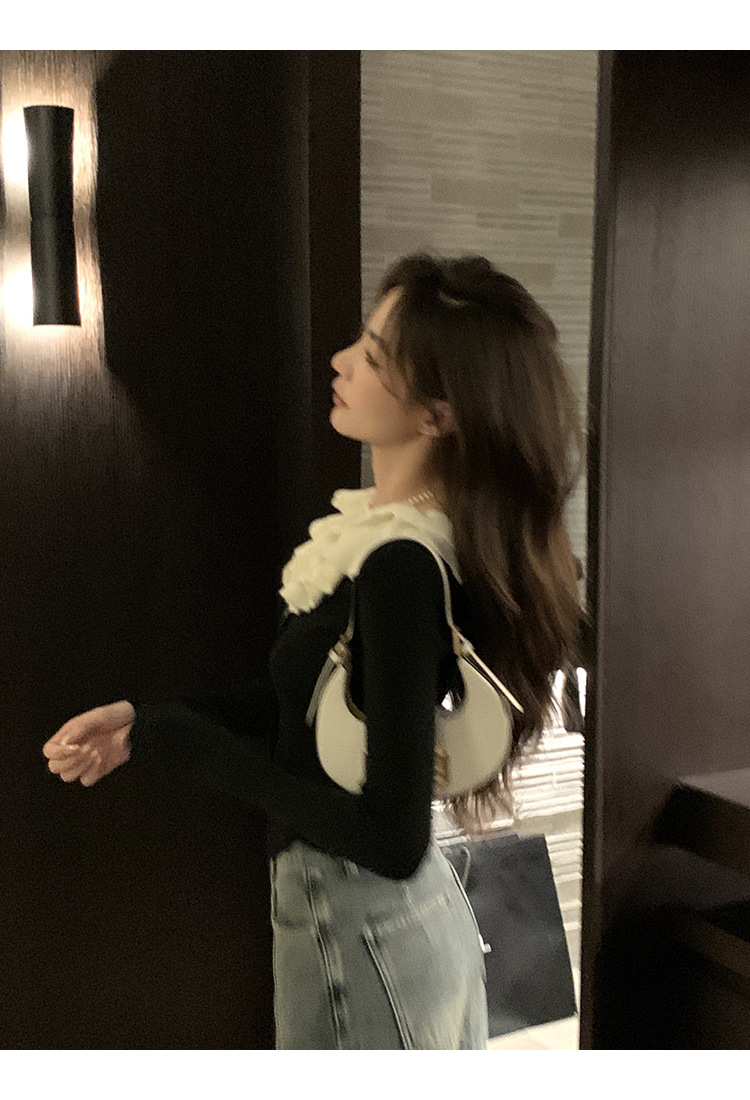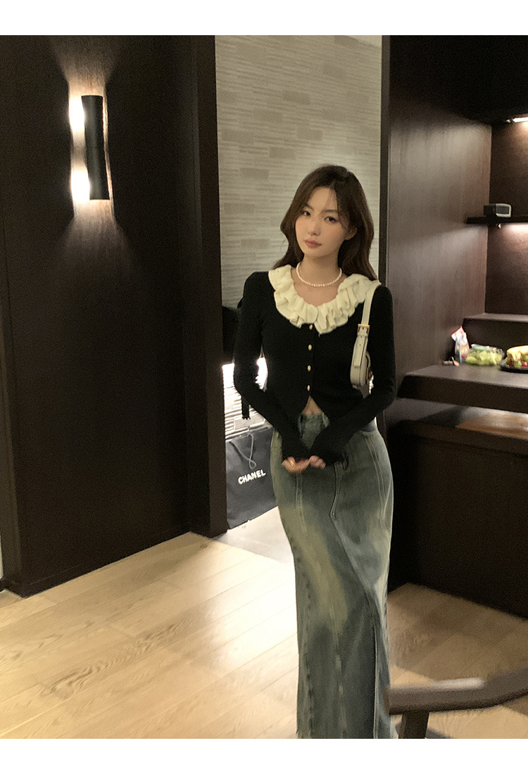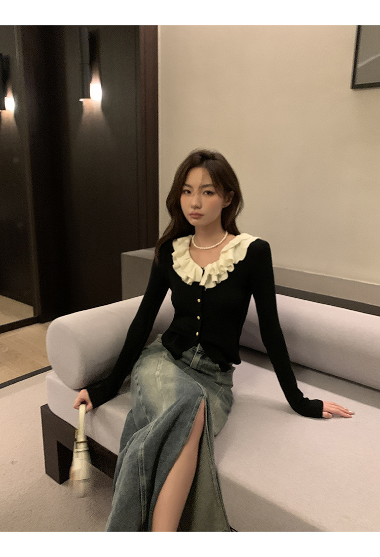 ソリッドカラーフリルカラー黒長袖多用途痩身スプライシング初秋シックなデザインの女性用ショートセーター