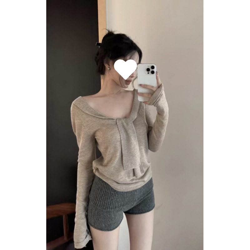 飘带v领长袖针织衫女装秋季修身显瘦打底衫纯色chic百搭上衣工厂