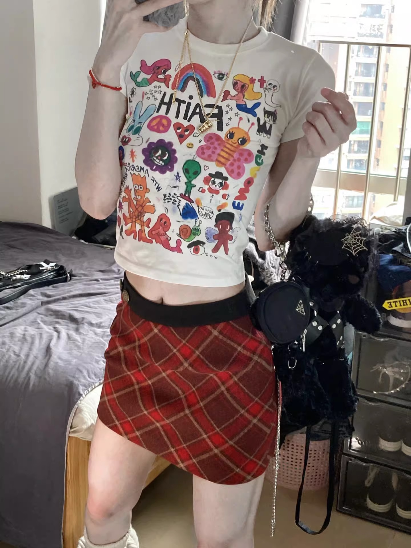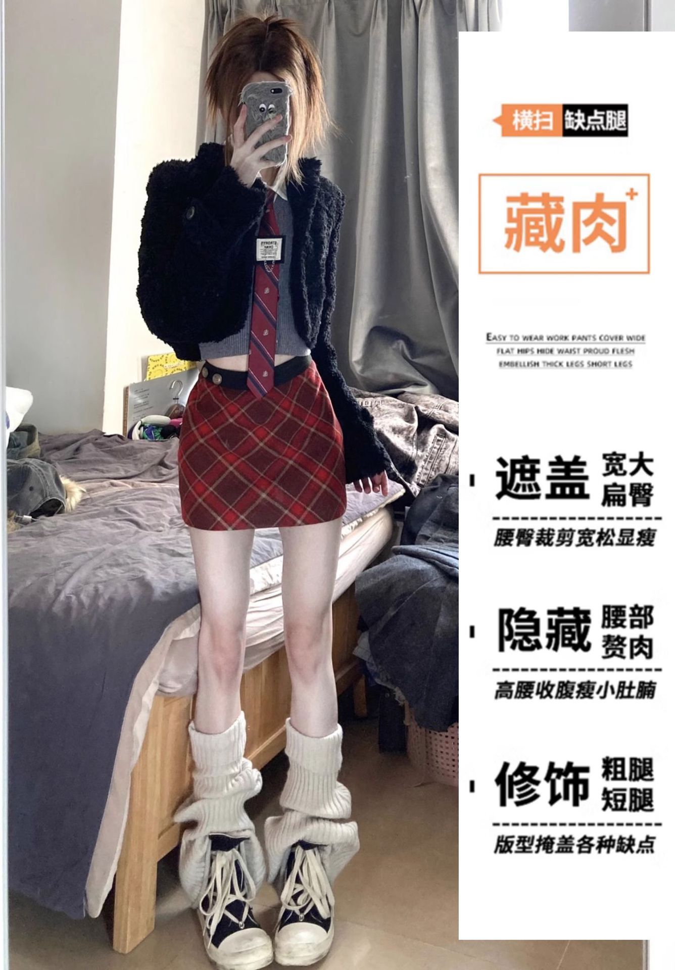 レトロな赤い格子柄の大きいサイズのウールスカート、女性用、秋、ぽっちゃりさん向け、デザイン性のあるアメリカンスタイルのハイウエストの格子柄Aラインショートスカート