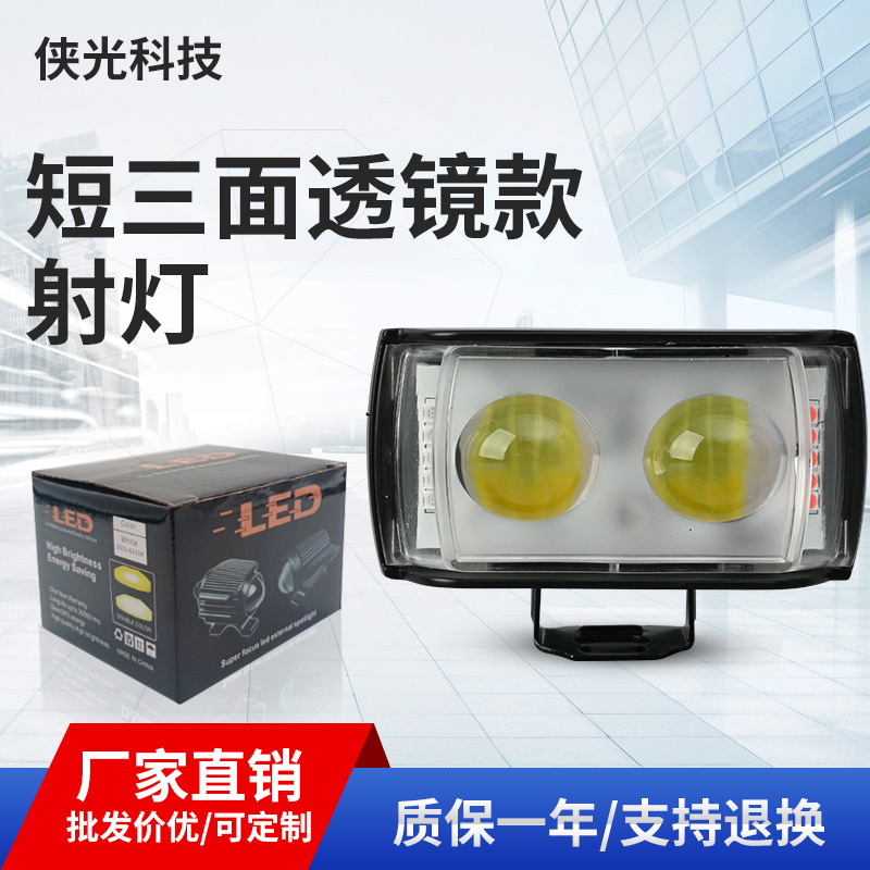 短型三面二球モーターサイクルスポットライト、ダブルレンズ、黄白二色爆発点滅フロントライト、改造ライト、電動自転車ライト