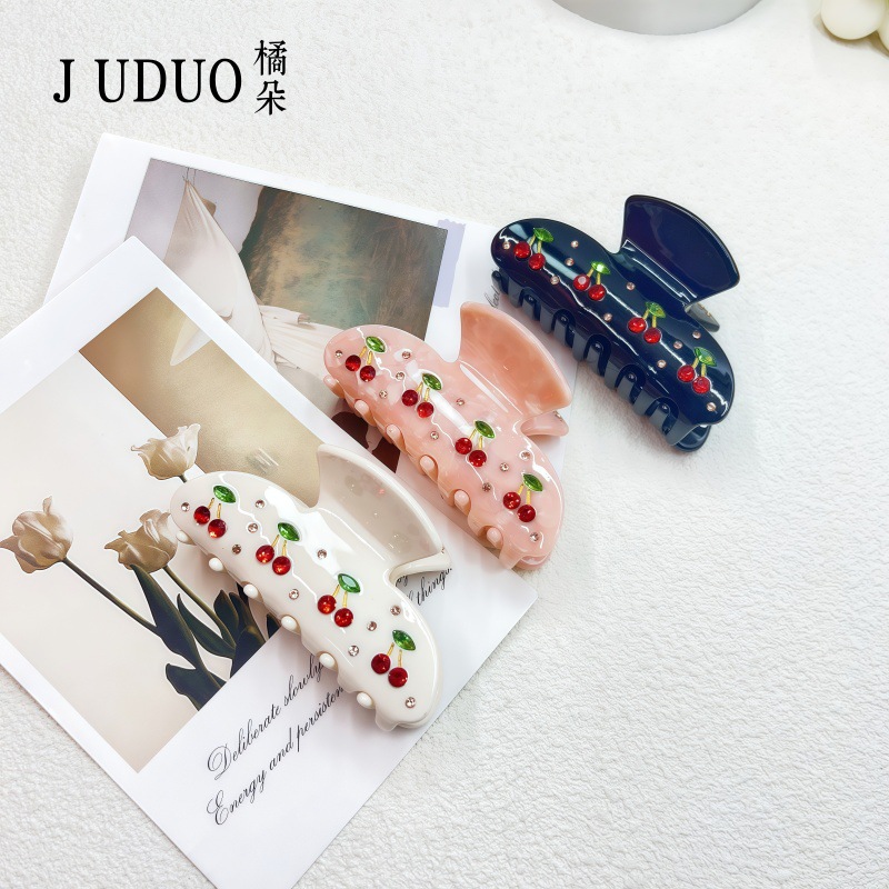 田園風エミジェイ可愛いチェリーパイラインストーンヘアクリップ後頭部ヘアピン酢酸シャーククリップヘアアクセサリー女の子向け