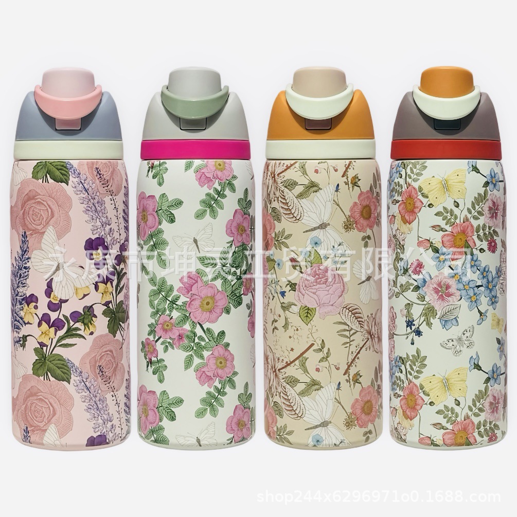 国境を越えた新製品 32 オンス オワラ フルーツ カップ、同じスタイルの絶妙な蝶の花柄のステンレス鋼魔法瓶カップ