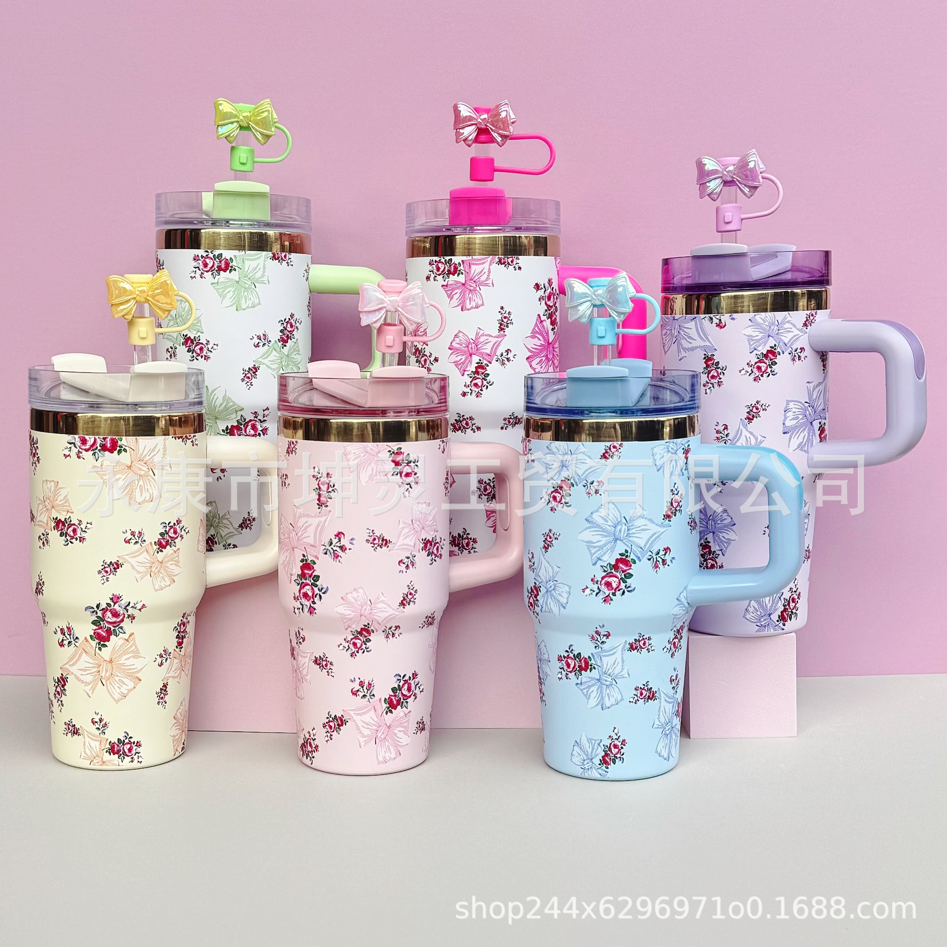 国境を越えた人気の14オンスの蝶結び花柄電気メッキゴールドとカラフルな蝶結びストロー防塵プラグ魔法瓶カップ