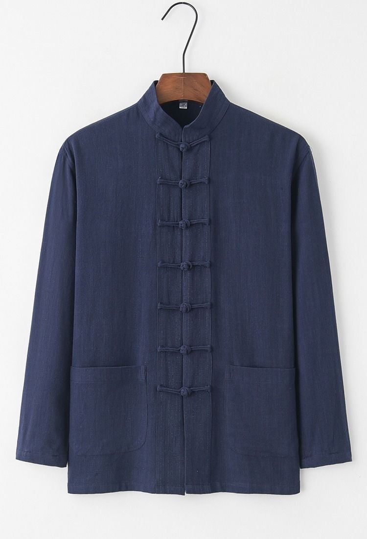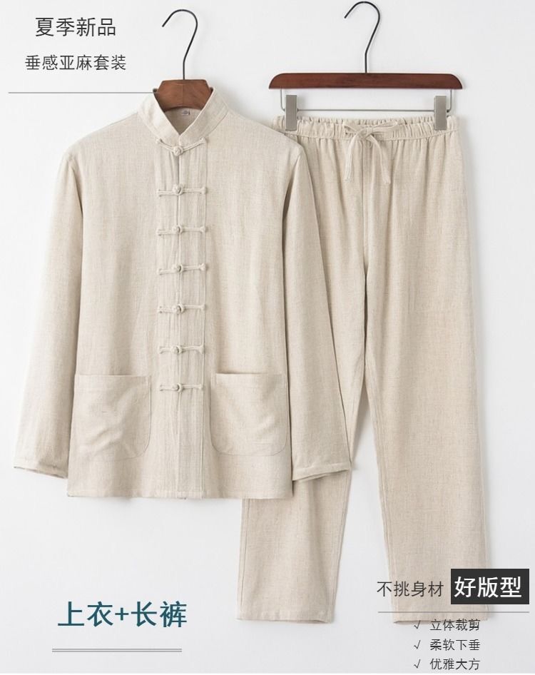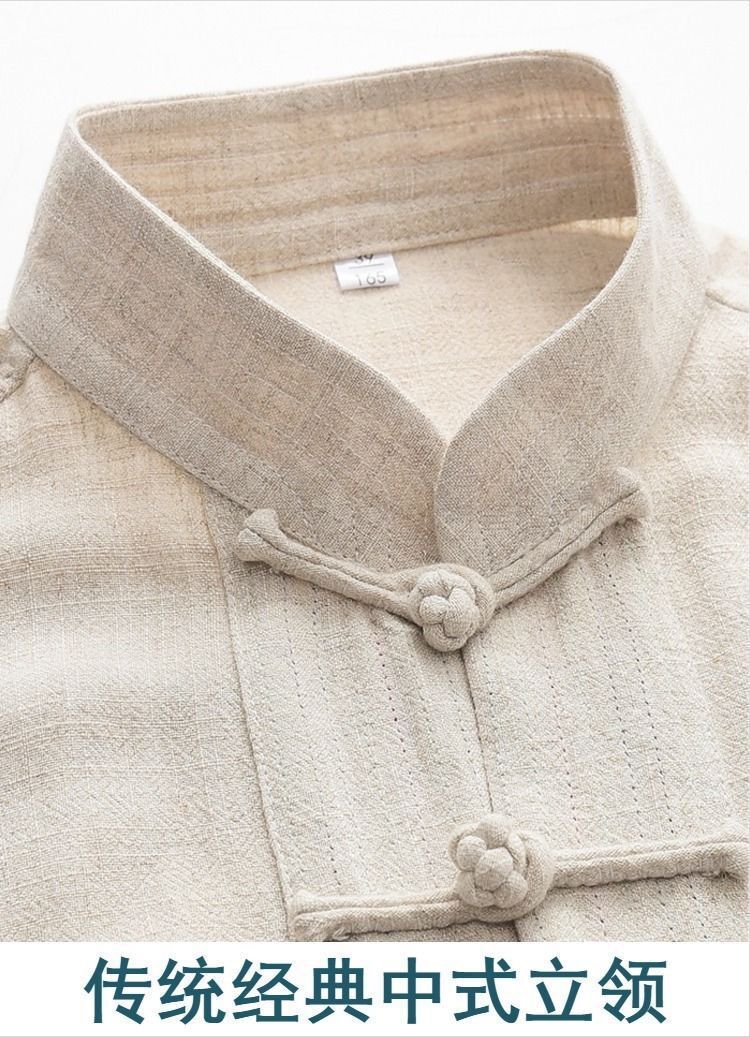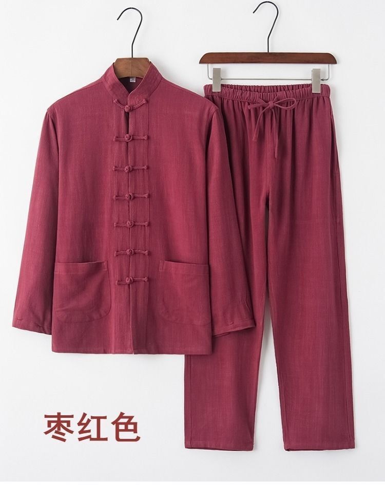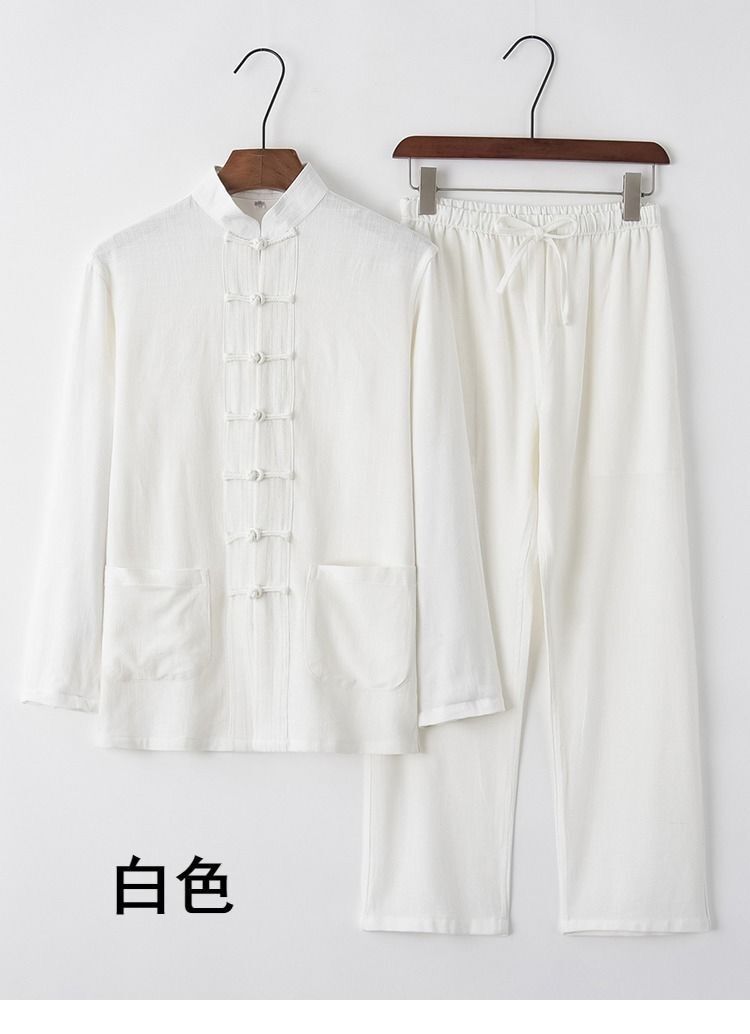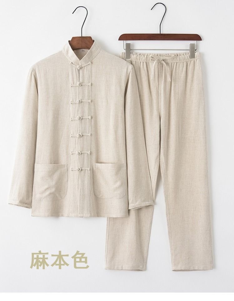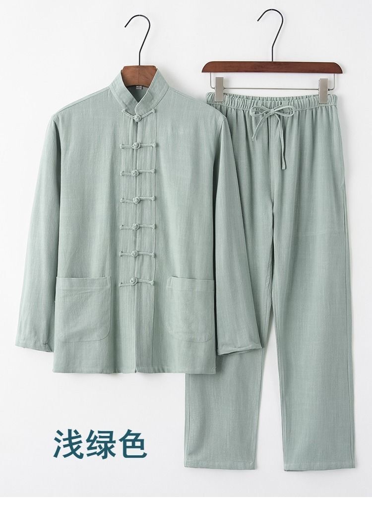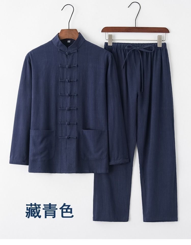 中国風唐装メンズ長袖スーツ中国風レトロ紳士服青中高年シャツ茶服禅瞑想服