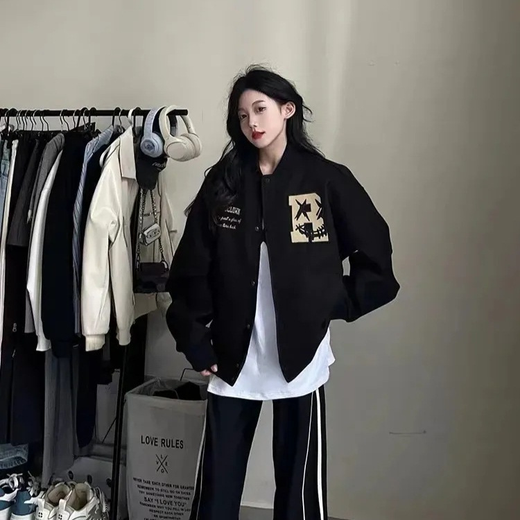 黒いスタンドカラーのアメリカのレトロなジャケットの野球服の女性の早春の2024年の新型のデザイン感の小さい大衆のスーツのコート
