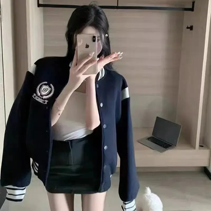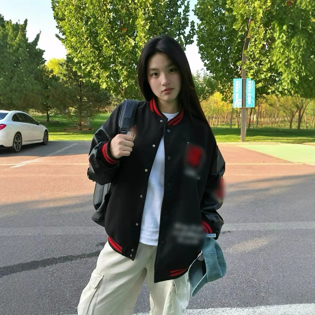 アメリカのゆるい灰色の野球服の女性2024春秋の新しいデザイン感復古学院風百合ショートコート