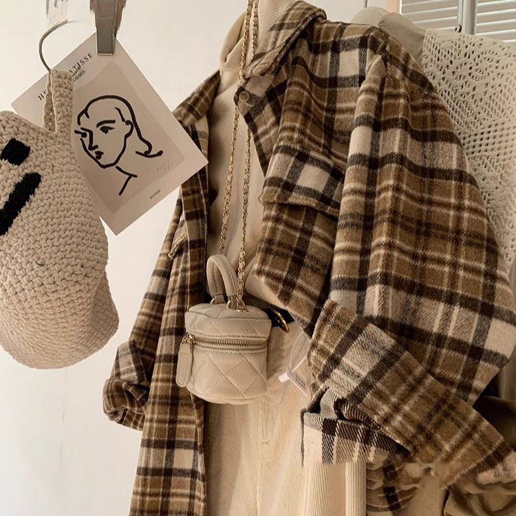 ~ 欧品のレトロな毛の格子の長袖のシャツの女性の春秋のゆったりしている怠惰な中で上着のコートを掛けます。