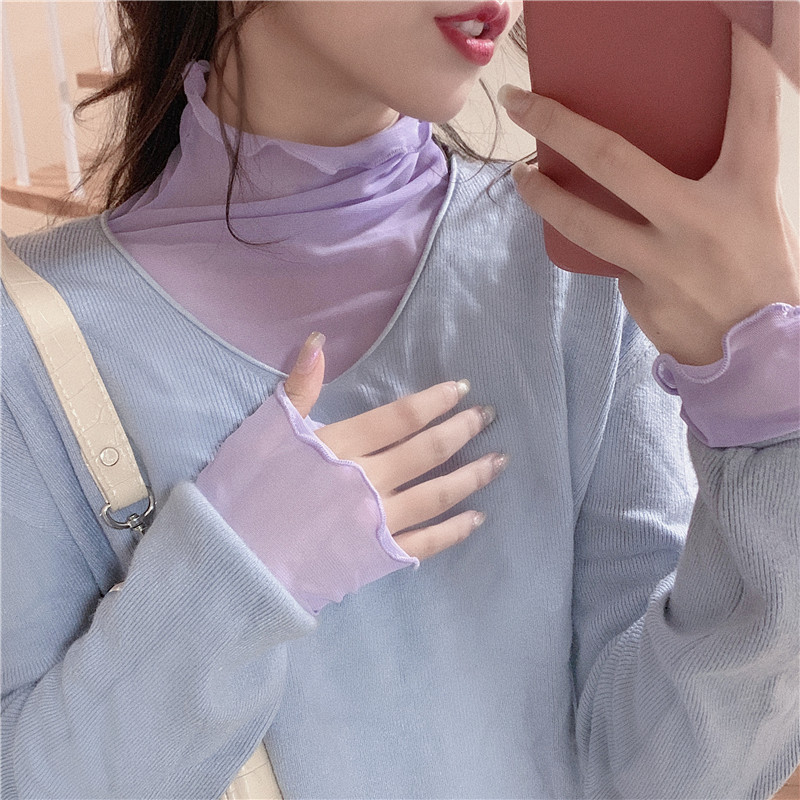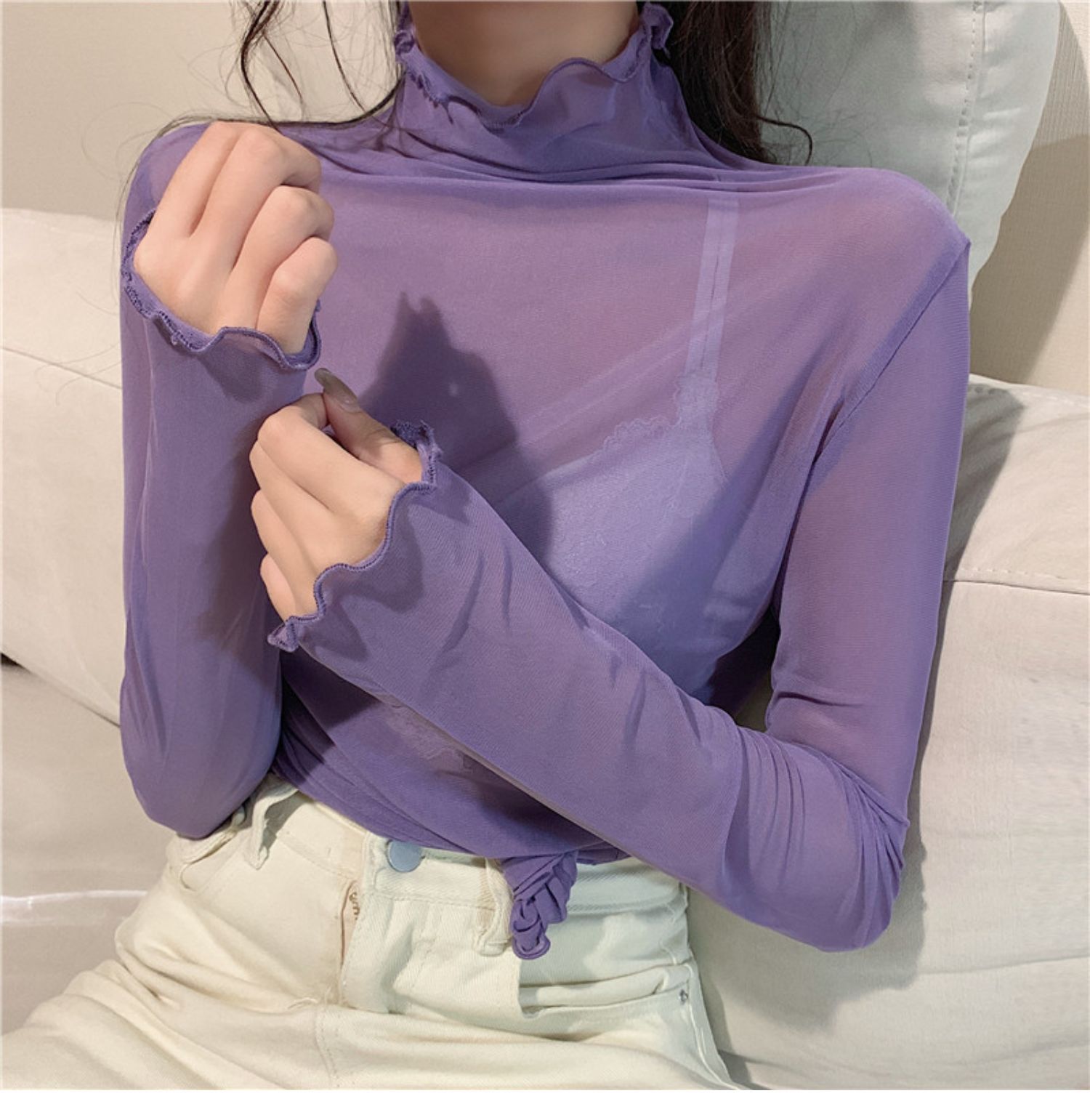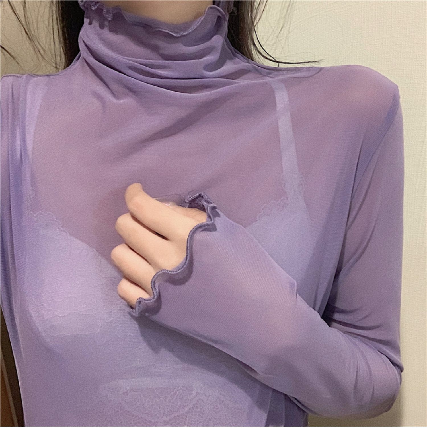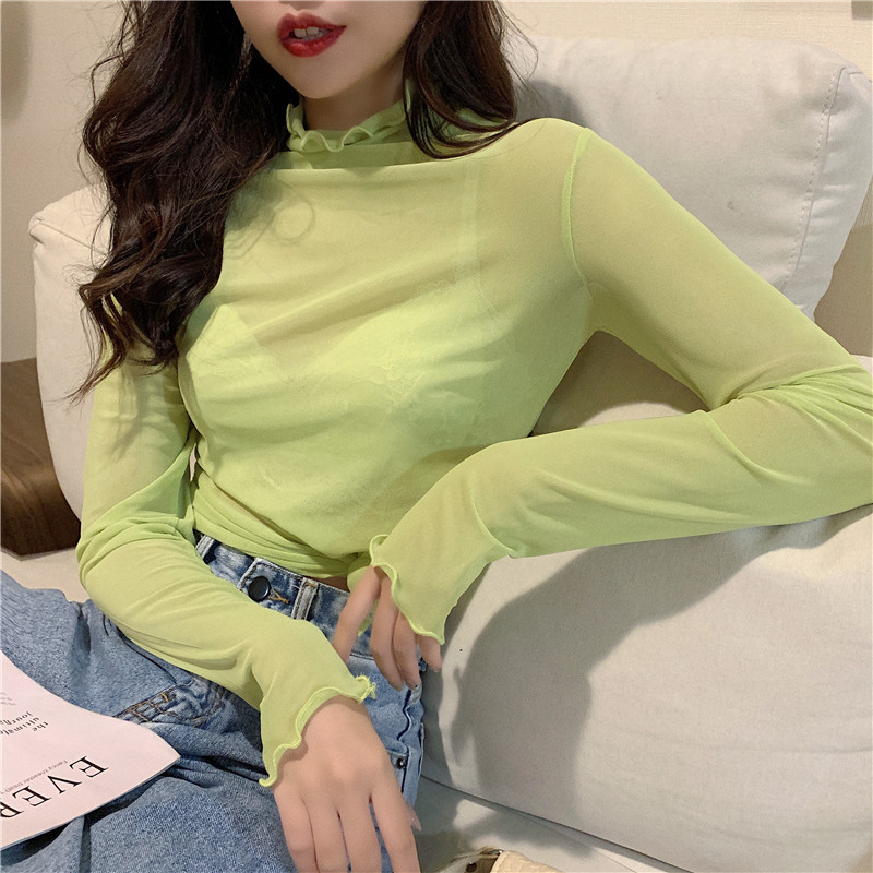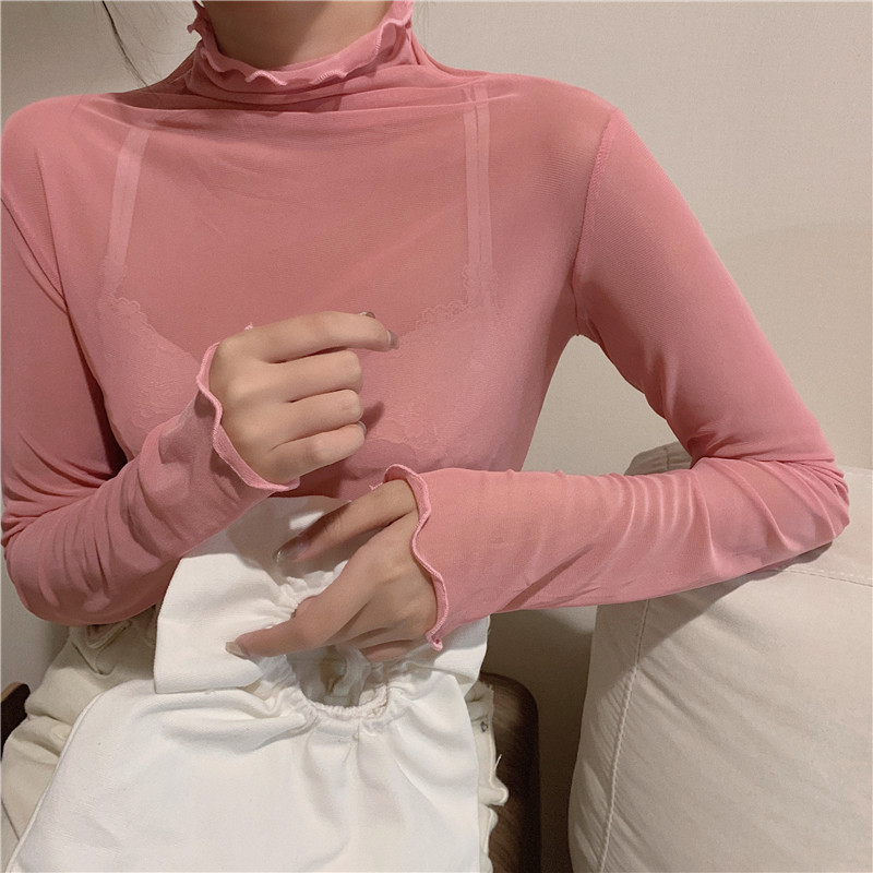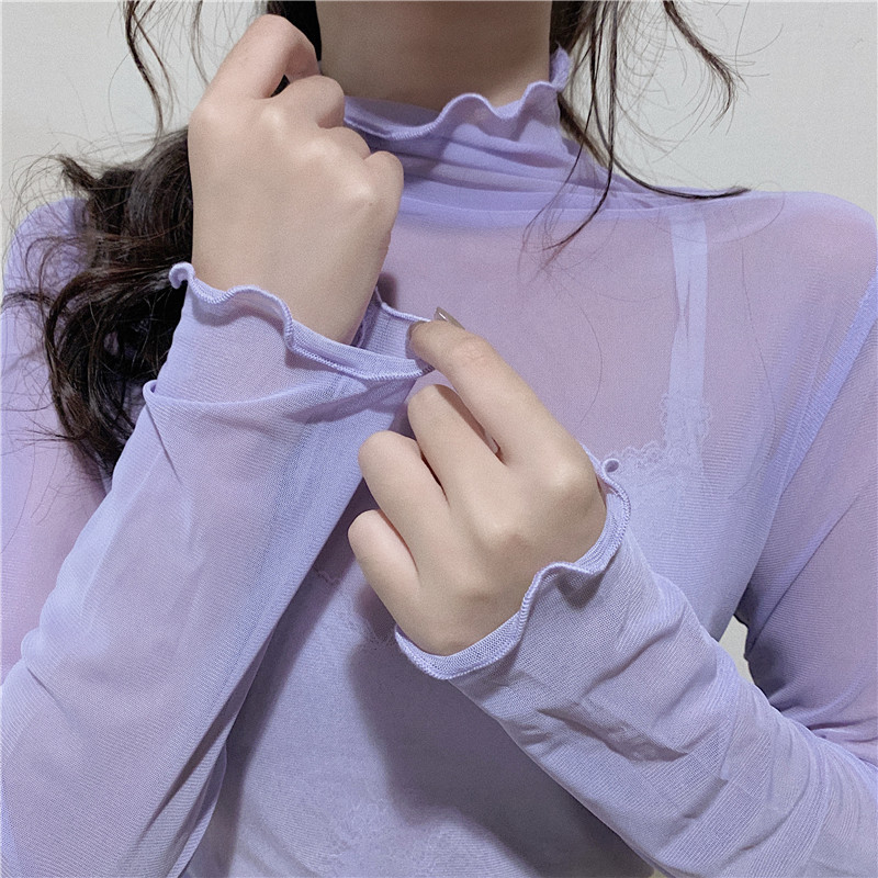 紫色边高领网纱打底衫薄纱内搭修身微透打底衫彩色多巴胺穿搭