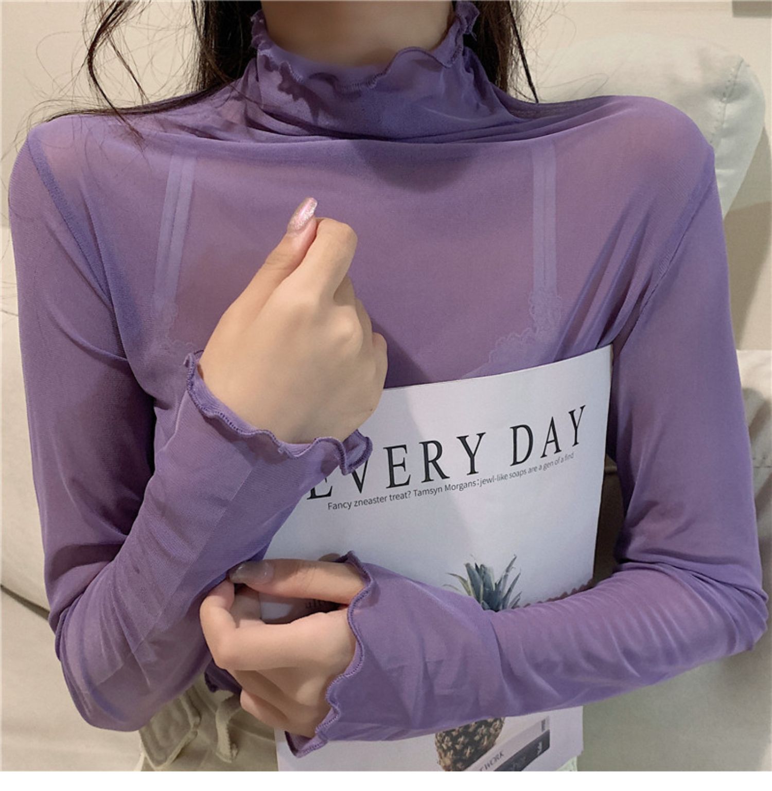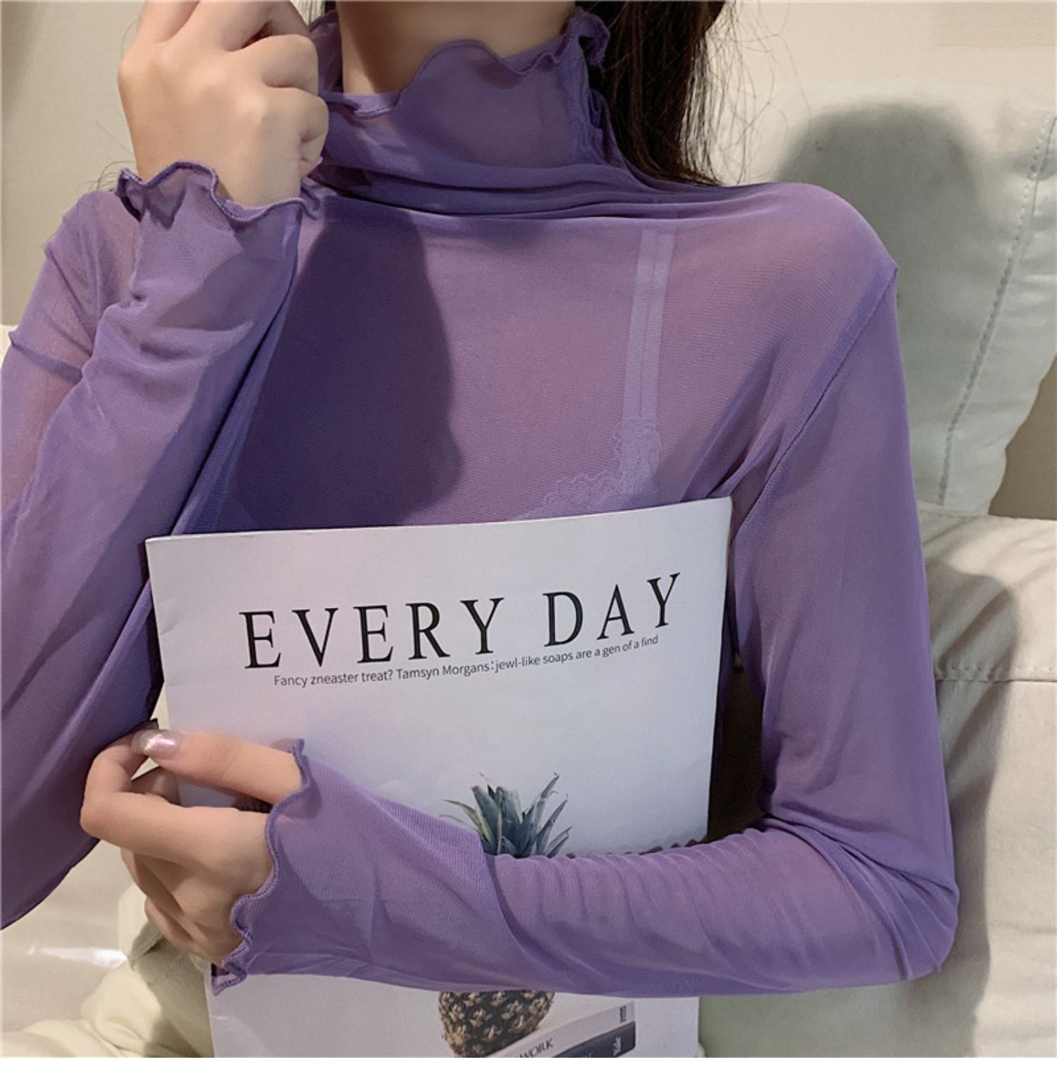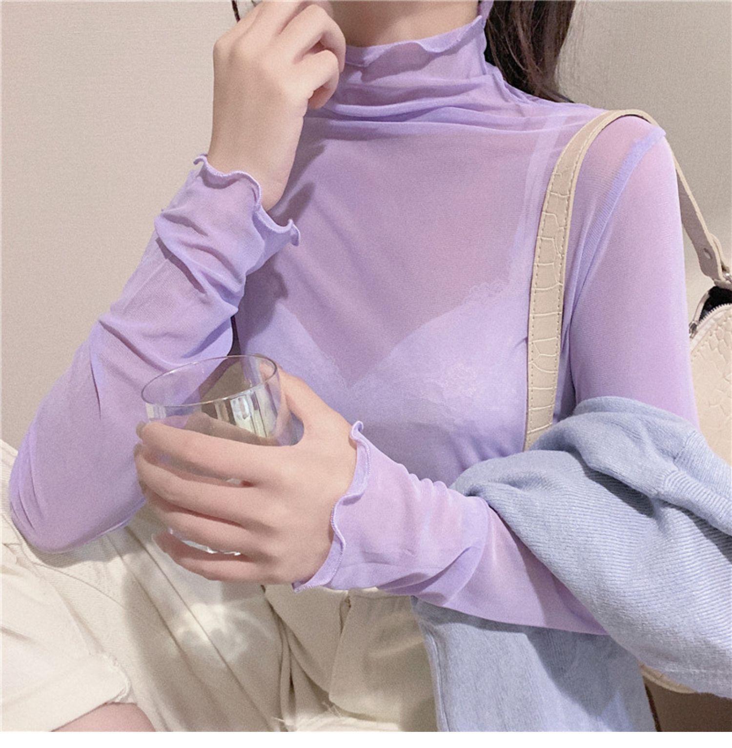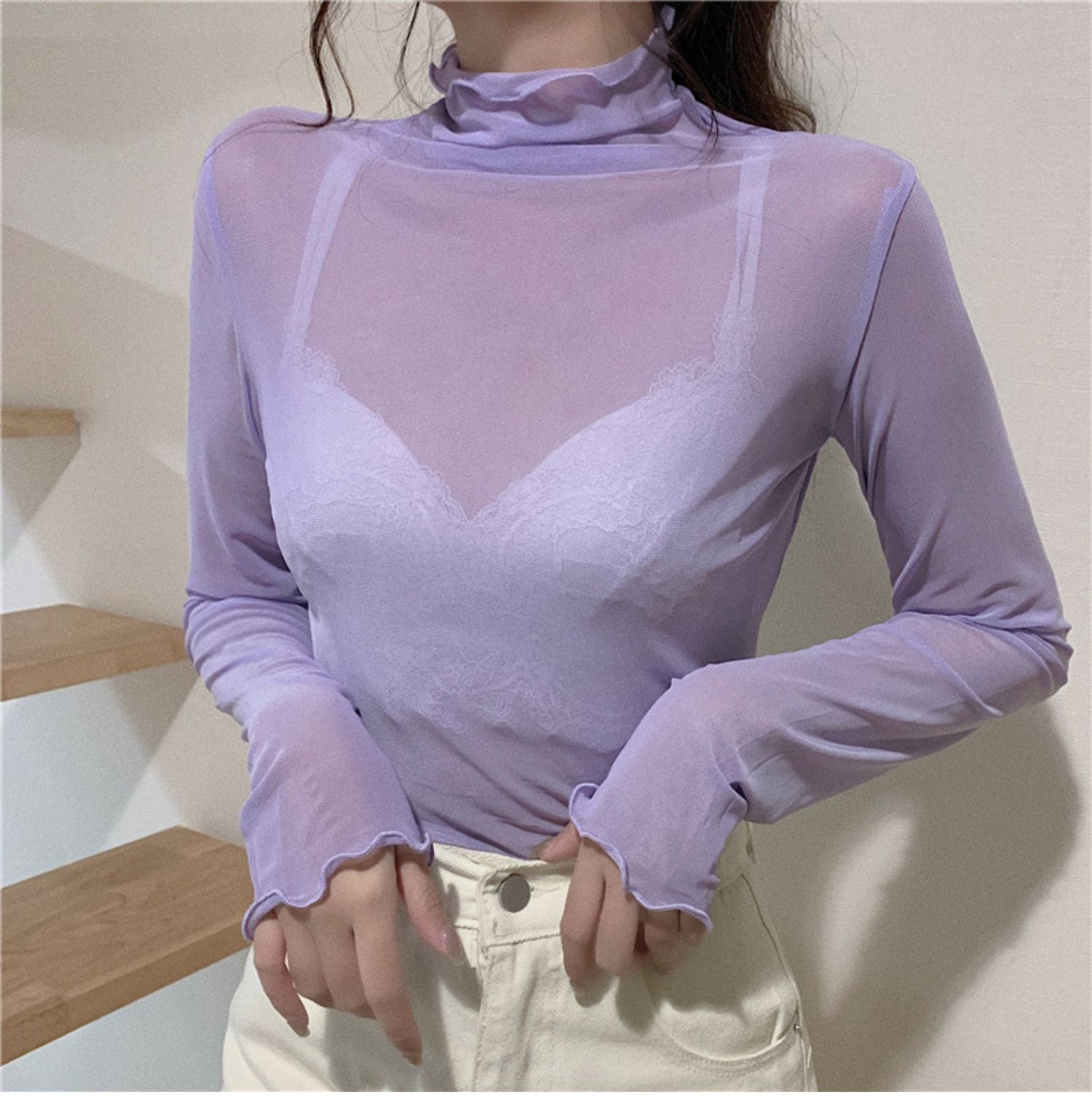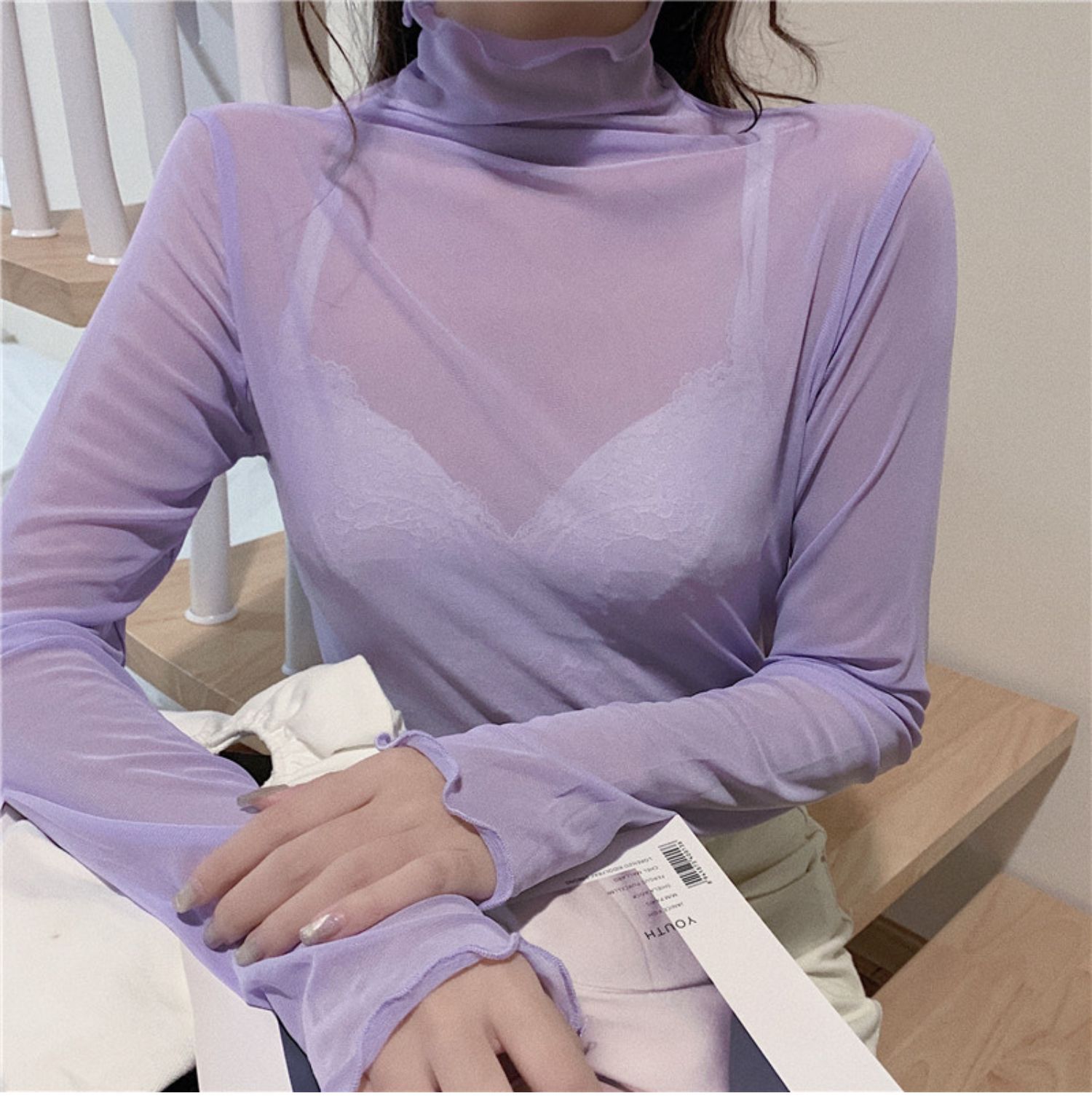 紫色边高领网纱打底衫薄纱内搭修身微透打底衫彩色多巴胺穿搭