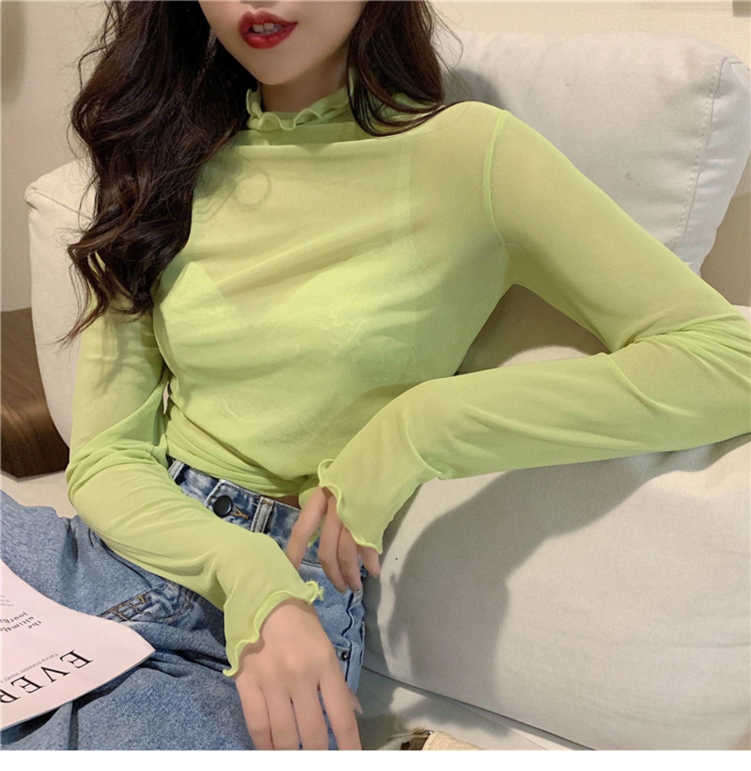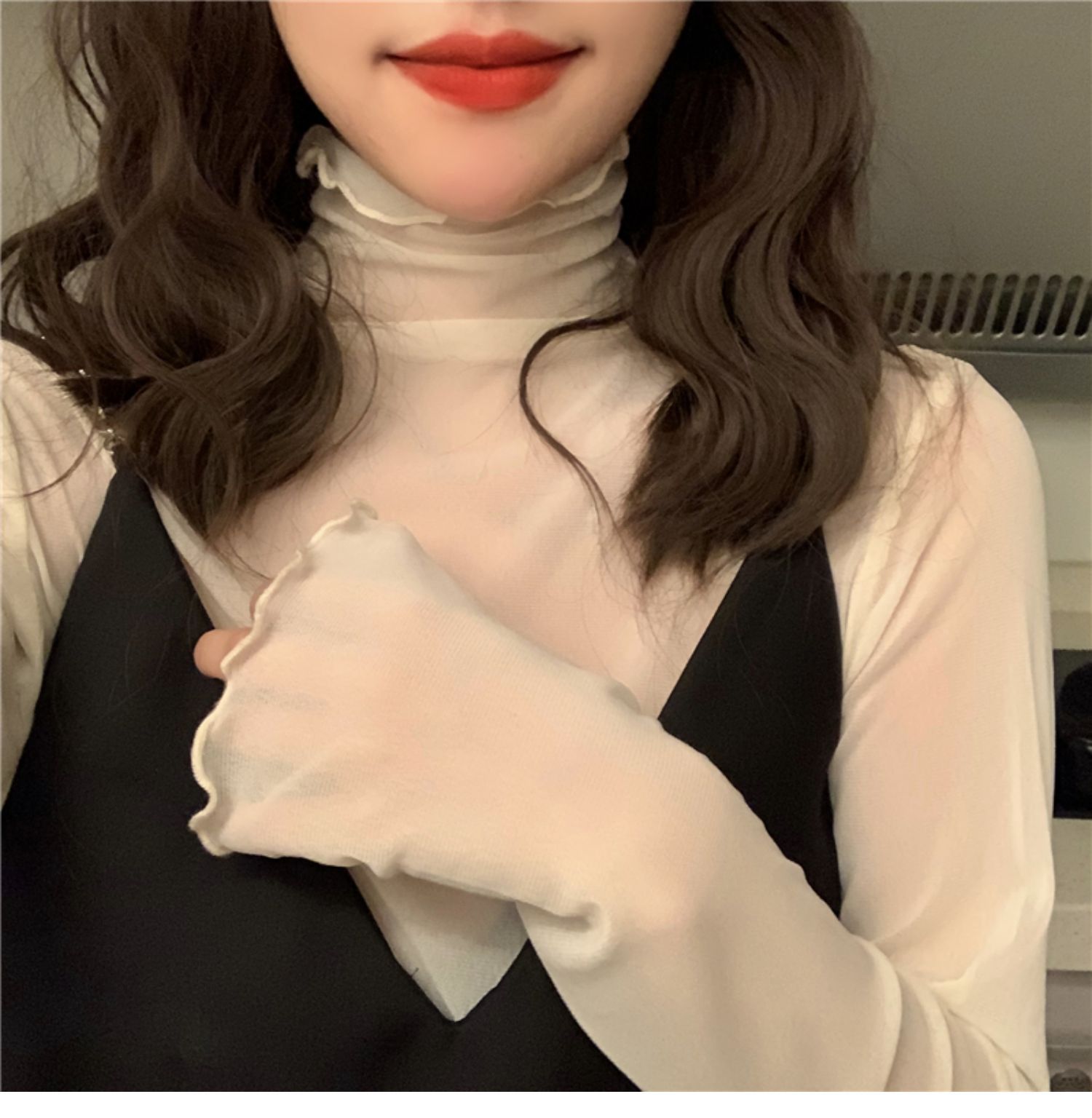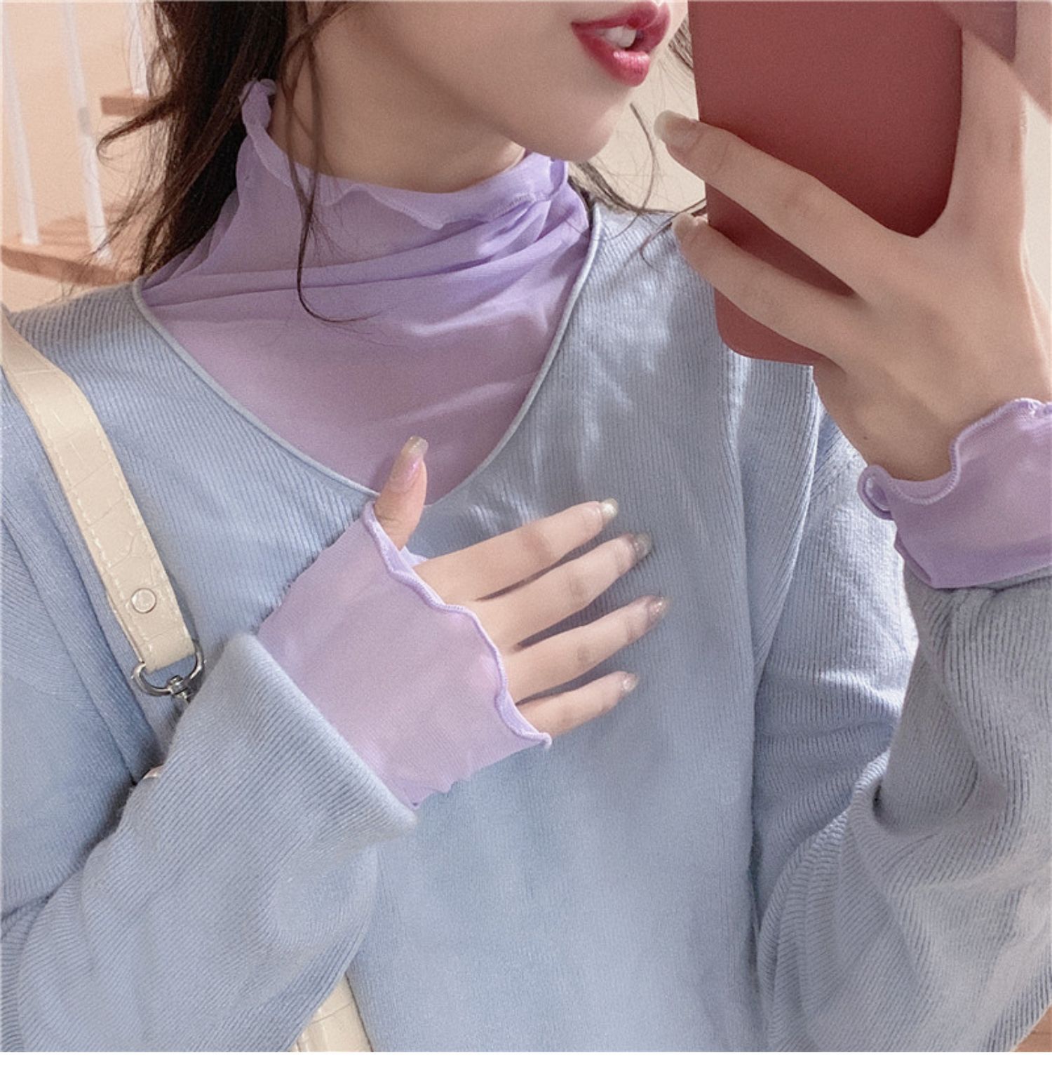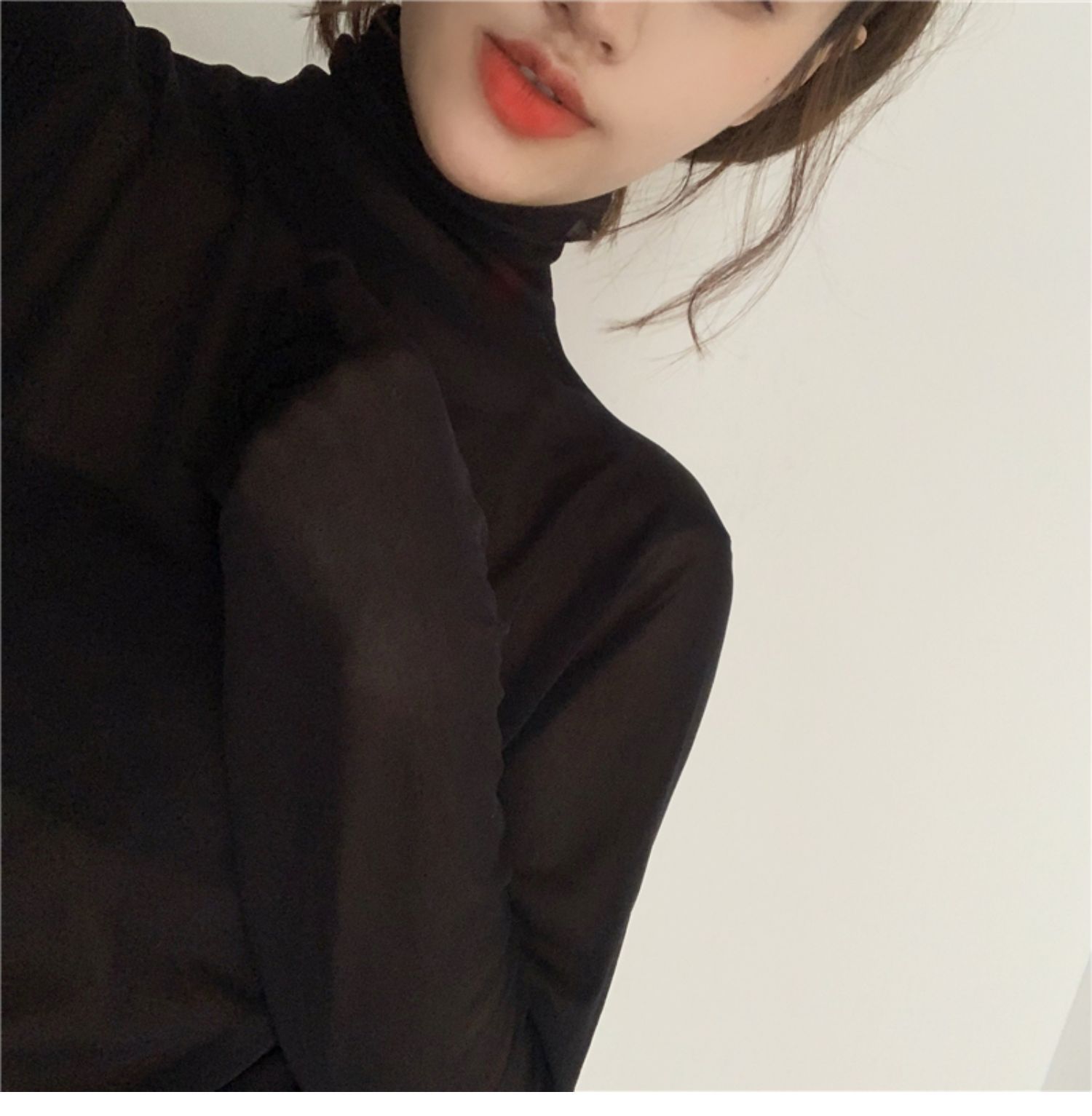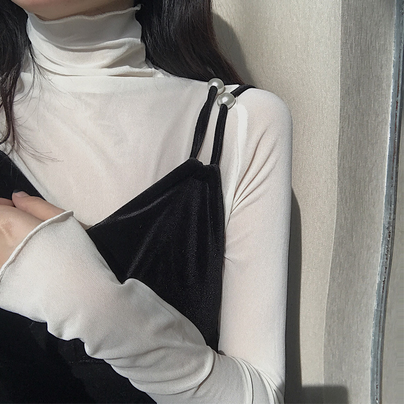 紫色边高领网纱打底衫薄纱内搭修身微透打底衫彩色多巴胺穿搭