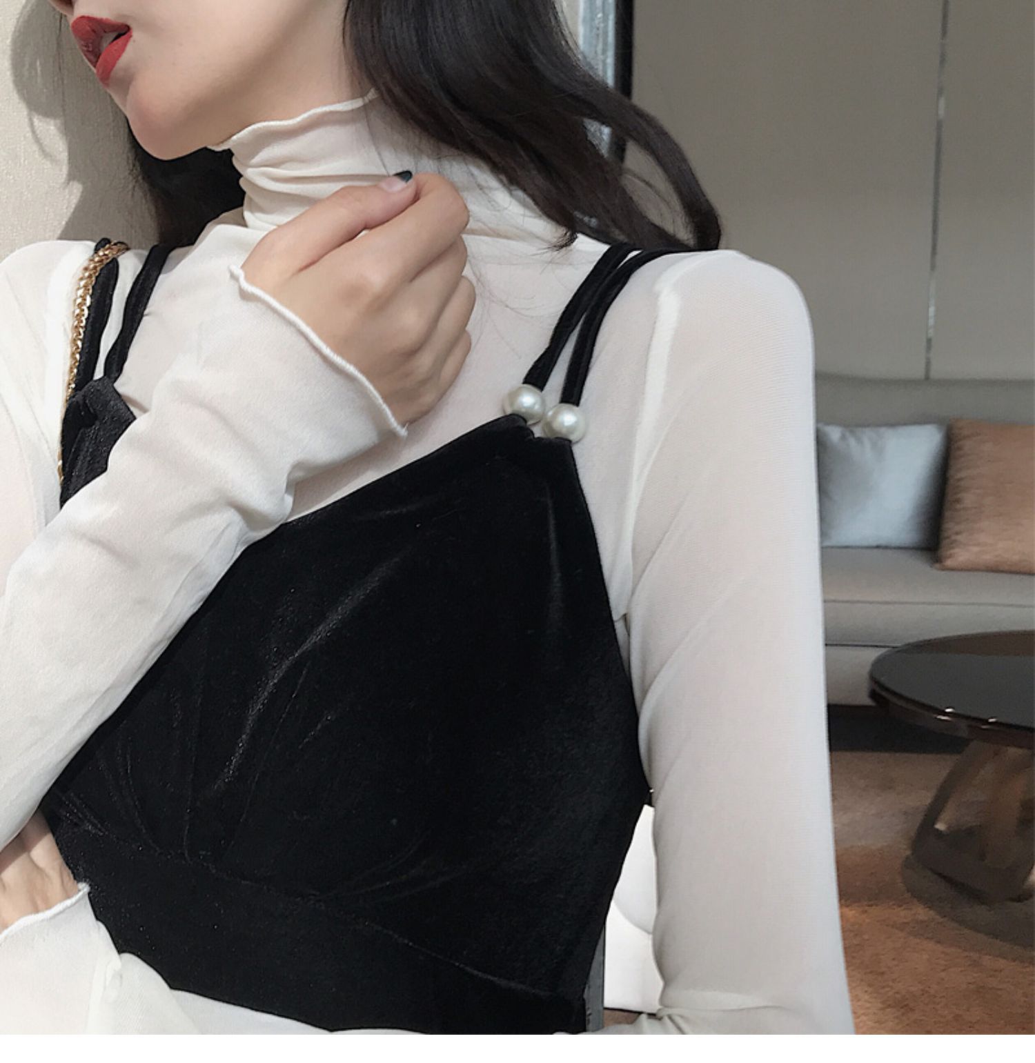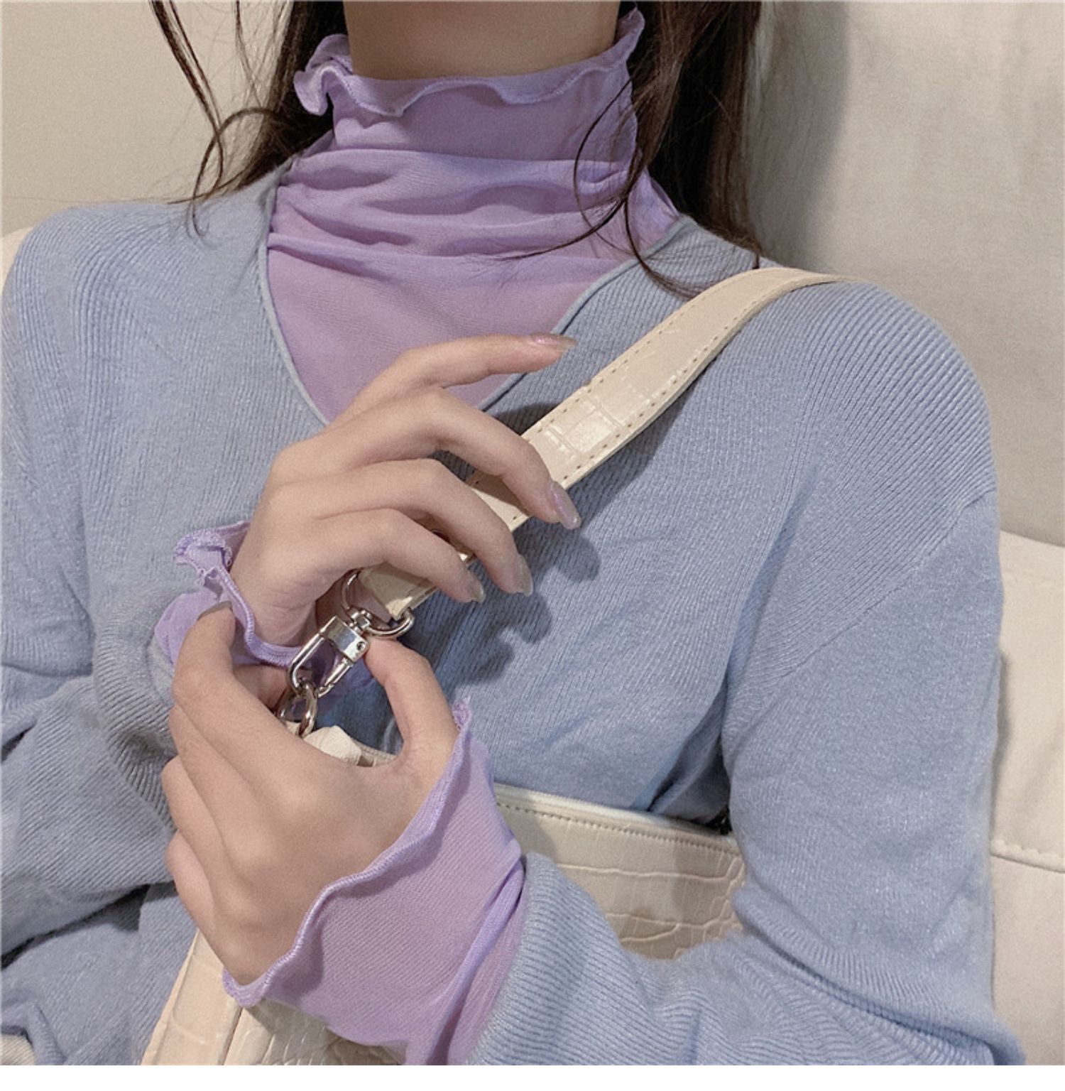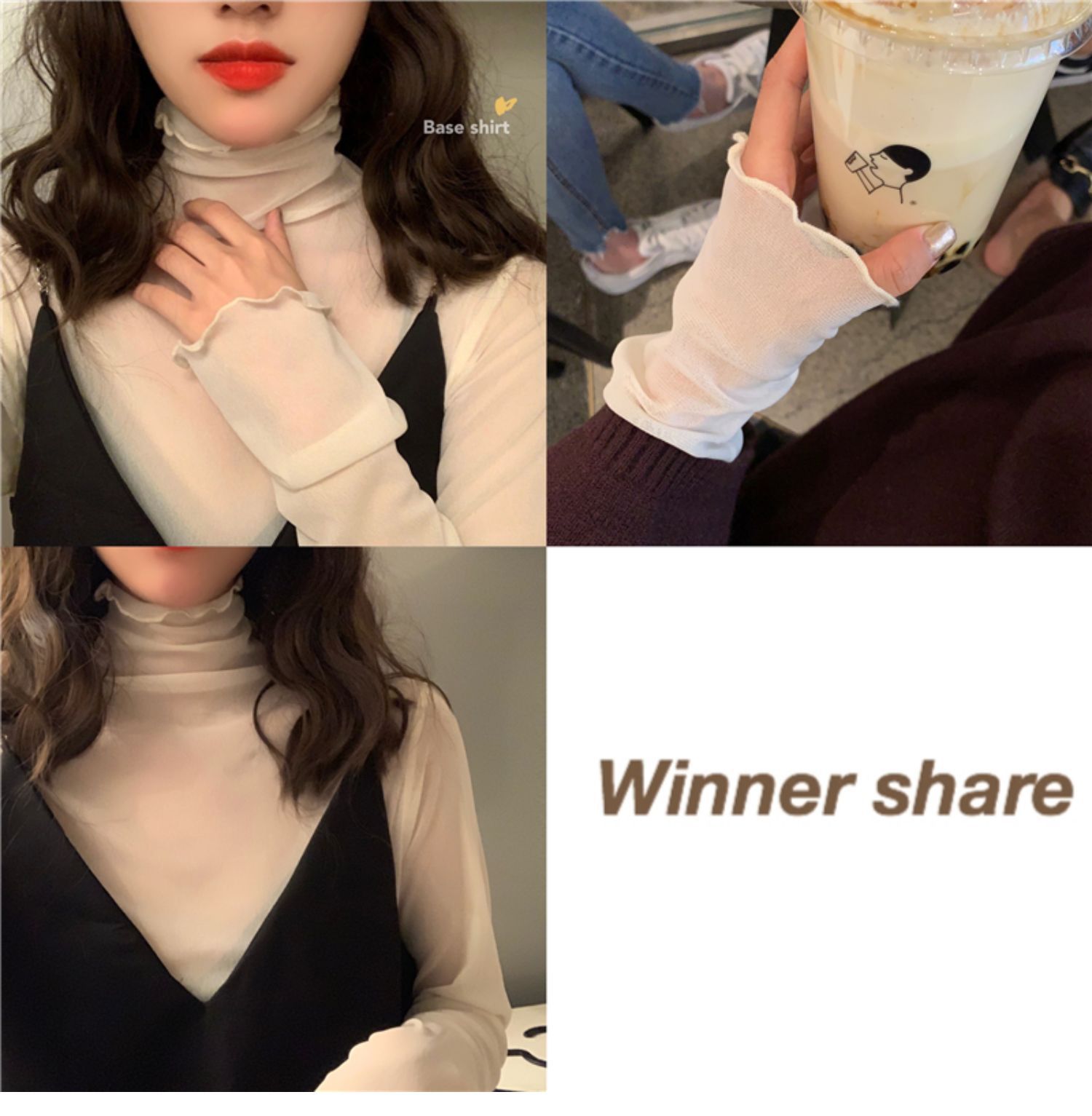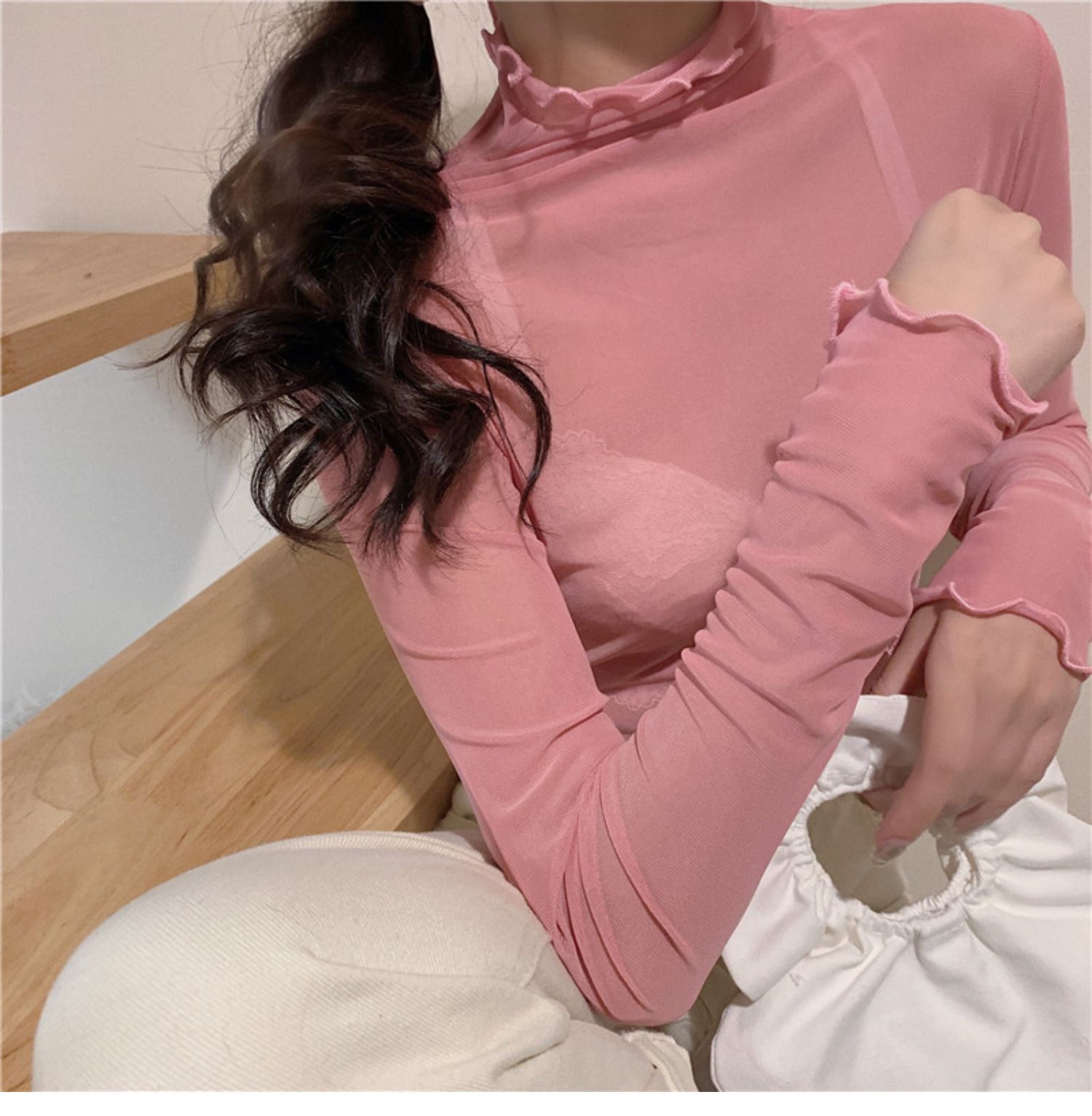紫色边高领网纱打底衫薄纱内搭修身微透打底衫彩色多巴胺穿搭