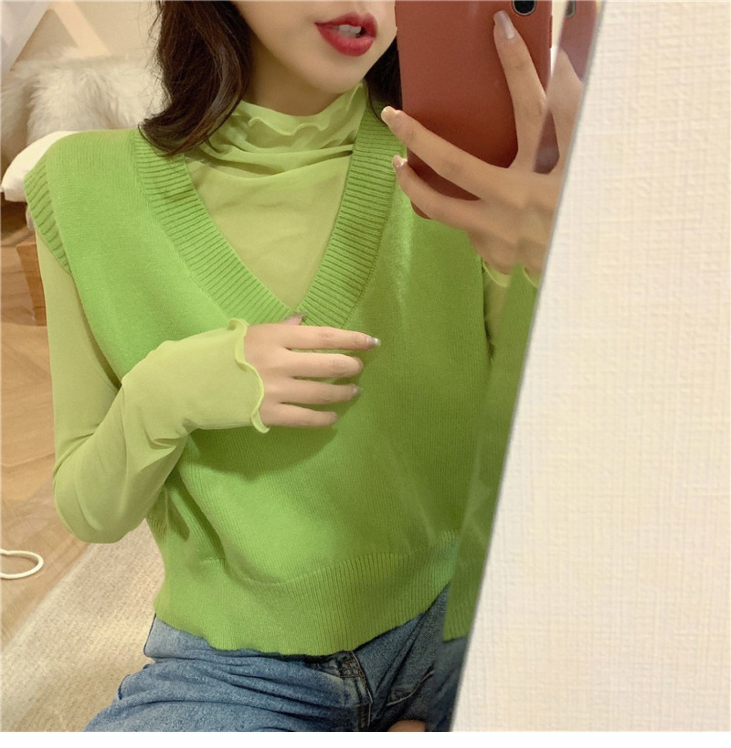 高襟の網の紗の底のシャツの女性の秋冬の洋気の木の耳元のセーターの中で薄い紗の服の長袖のガードルのレースの上着を掛けます。