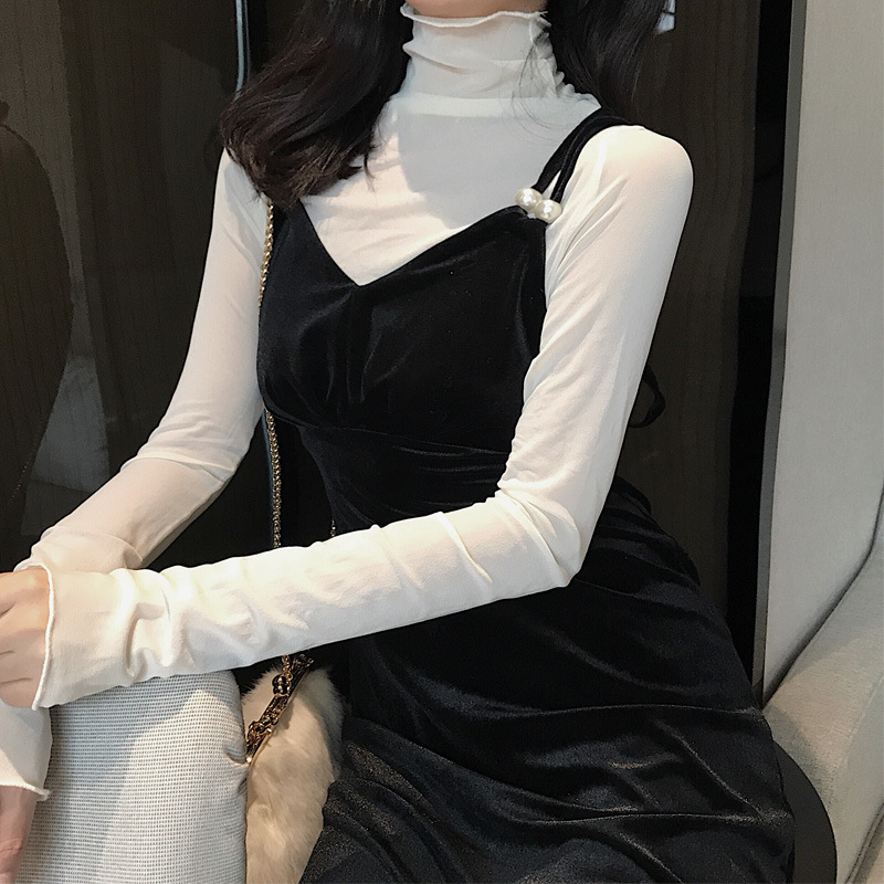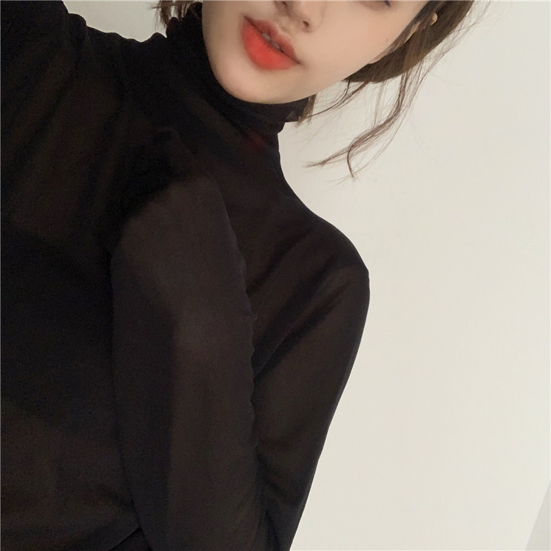 神仙網紗タイトなボトムシャツ女性の薄い高級なガーゼの中に洋気長袖沙t高襟レースの上着を掛けます。