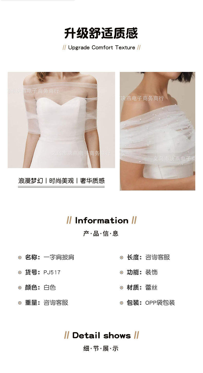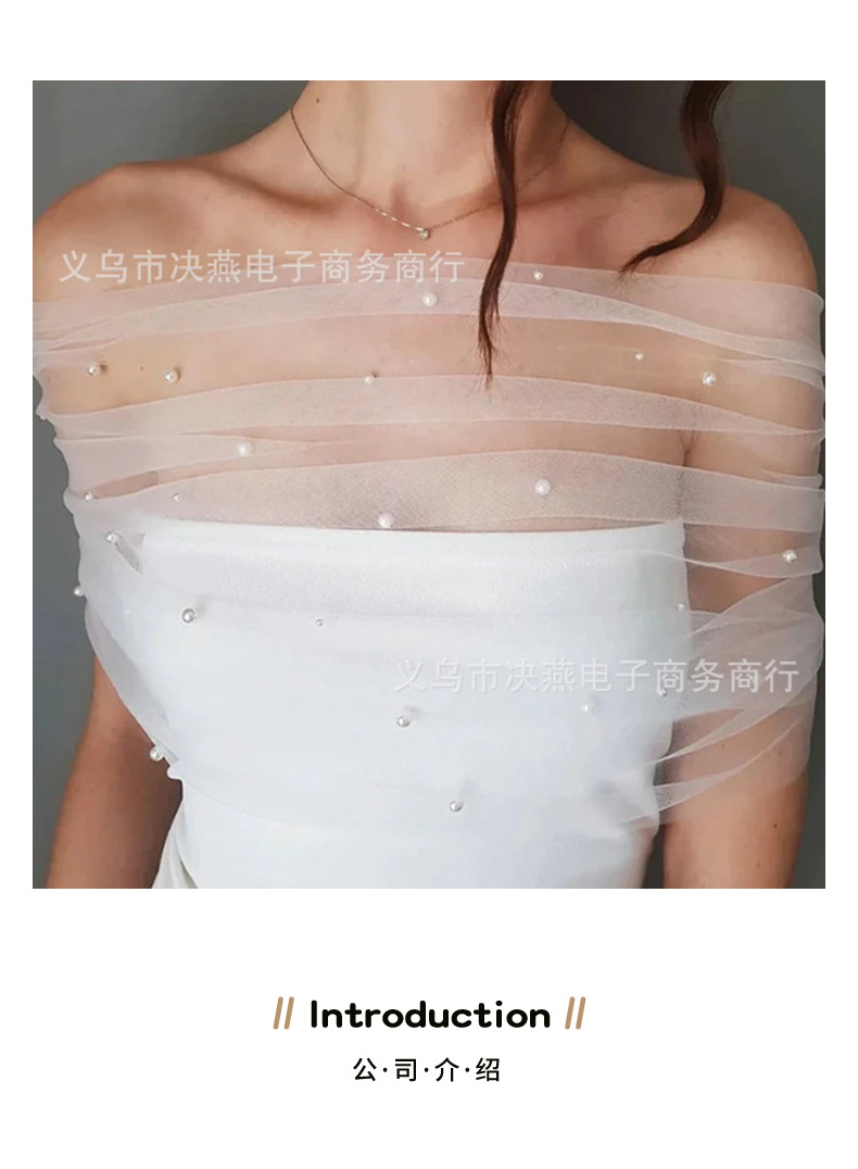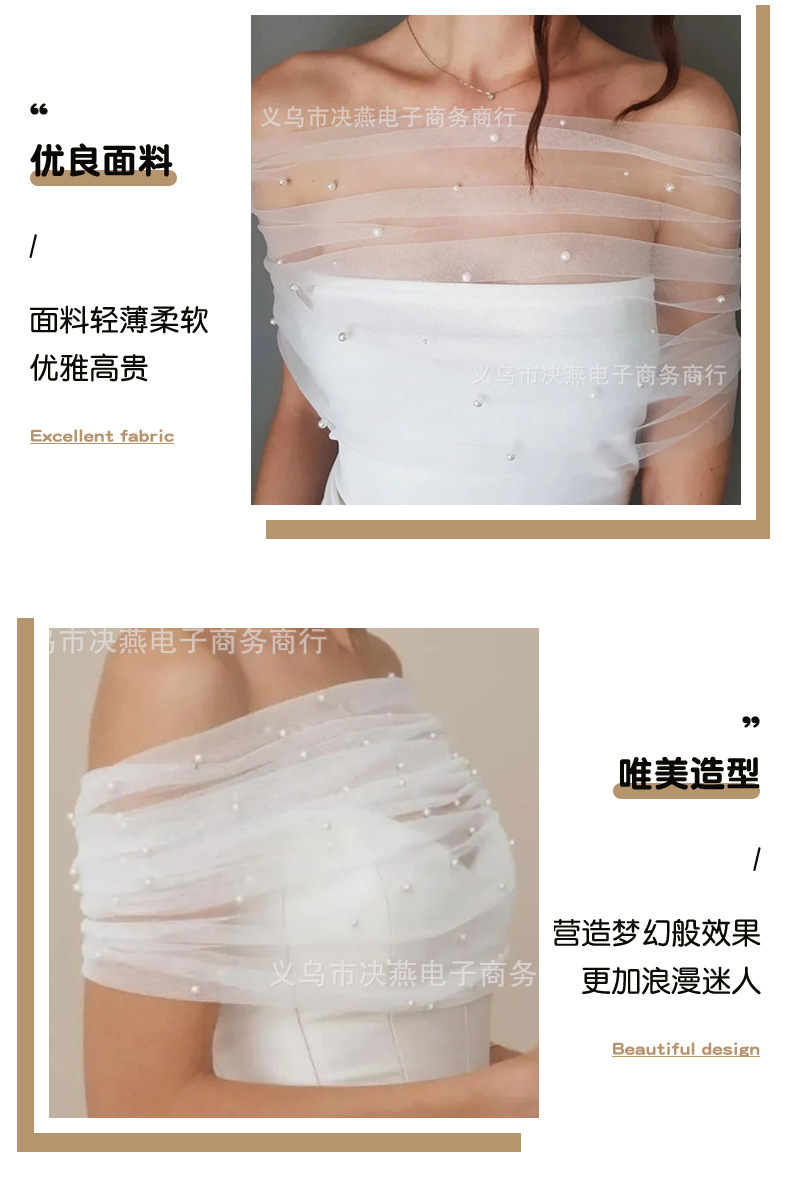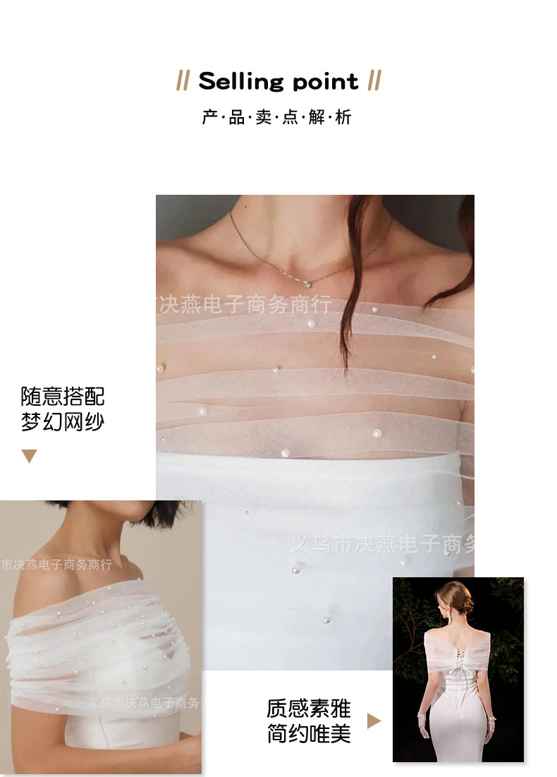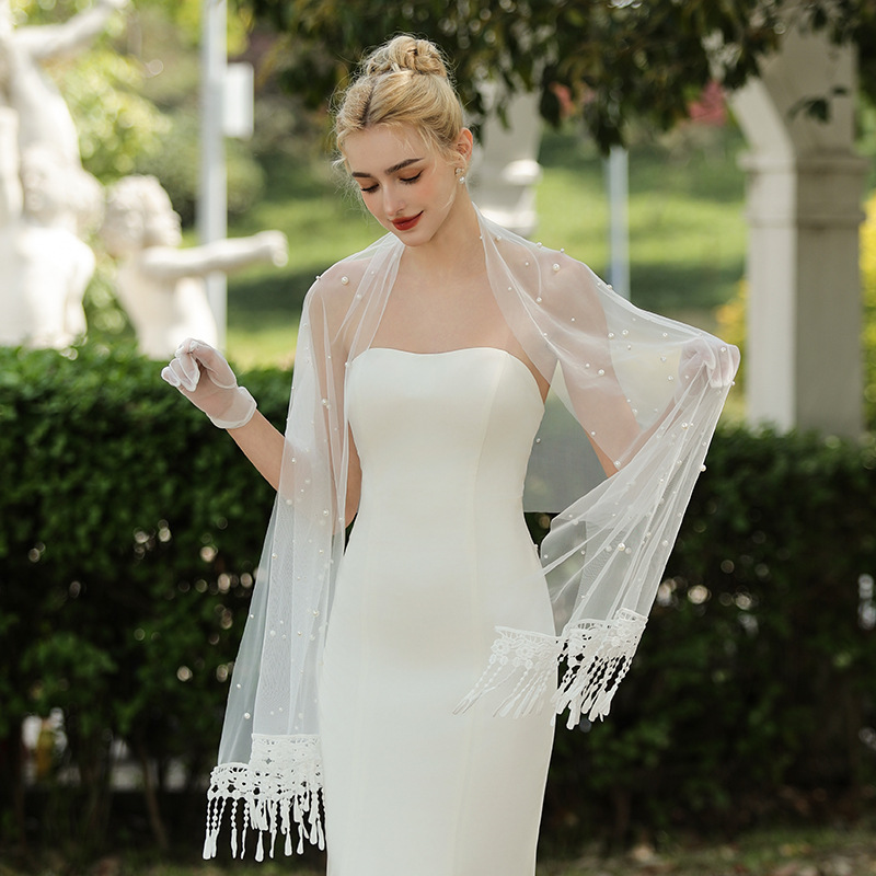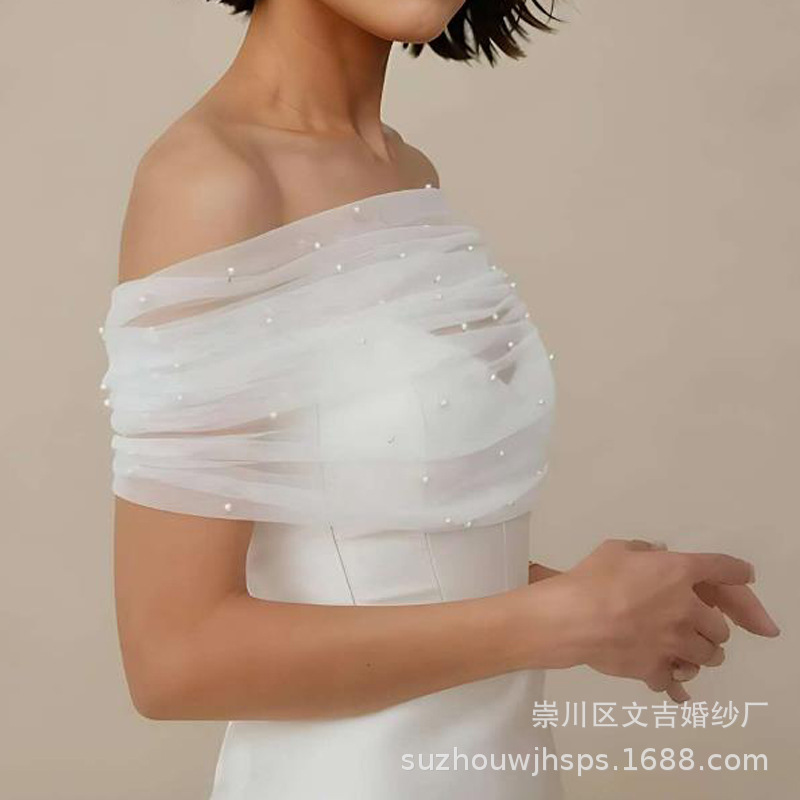 ヨーロッパとアメリカのフレンチブライダルウェディングドレスワンラインパールガーゼショールウェディングドレス白と黒のメッシュアームカバーショルダーラップ卸売