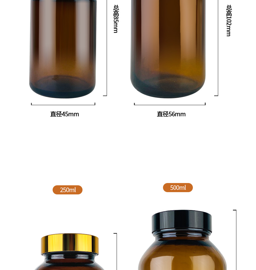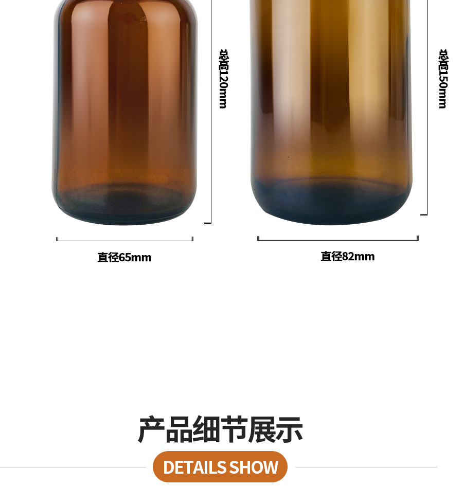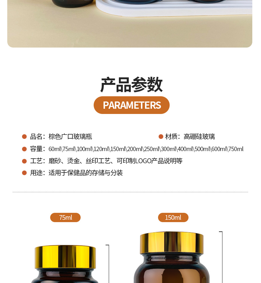 規格型番 60ml(77mm * 44mm) 茶色,75ml(85mm * 45mm) 茶色,100ml(50mm * 90mm) 茶色,120ml(97mm * 53mm) 茶色,150ml(102mm * 56mm) 茶色,200ml(111mm * 62mm) 茶色,250ml(120mm * 65mm) 茶色,300ml(130mm * 68mm) 茶色,400ml(143mm * 75mm) 茶色,500ml(150mm * 82mm) 茶色,600ml(86mm * 158mm) 茶色,750ml(92mm * 170mm) 茶色