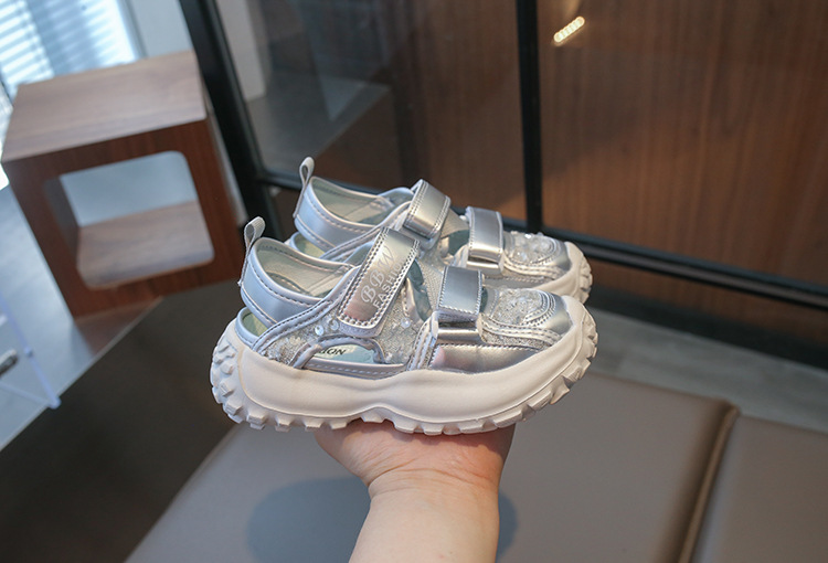 女の子の包頭編みサンダル2025夏の新型子供ファッション透かし彫りプリンセスサンダルソフト底ビーチサンダル