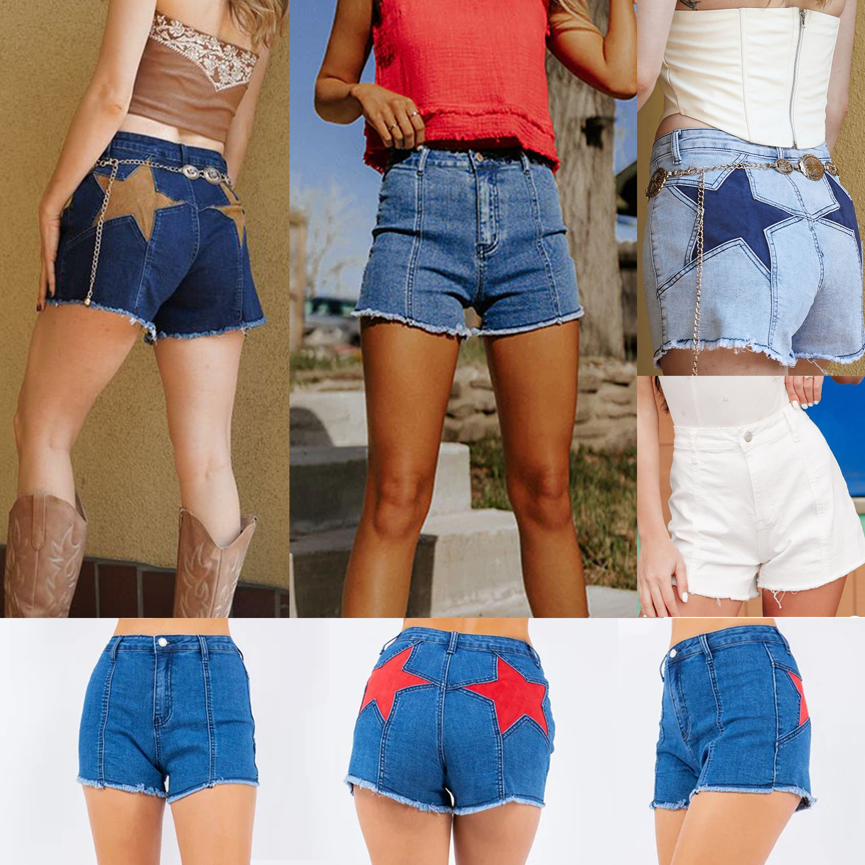 2025春夏の欧米の外国貿易の高品質のセクシーな女性は五角星のデニムのショートパンツのホットパンツの新型をつなぎ合わせます。