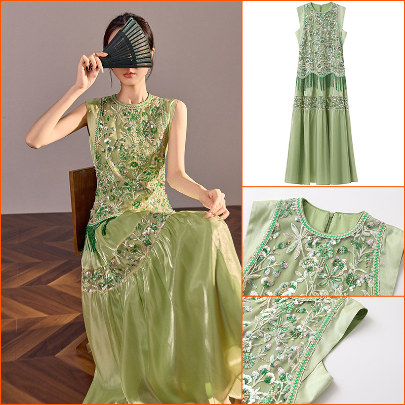 小香風新作、重厚なビーズ刺繍デザインのラウンドネックノースリーブワンピース、エレガントなウエストシェイプで着痩せ効果あり ZX型N1016