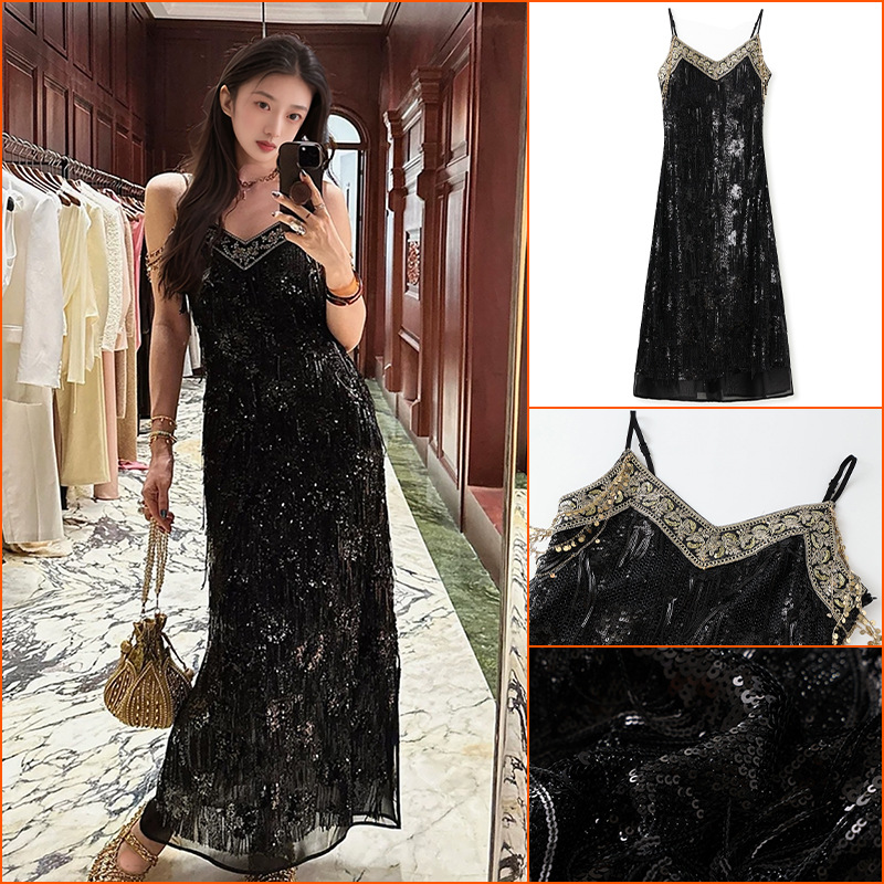 中国風 2025 夏ビーズメッシュ刺繍タッセルドレス女性の新しい中国風のハイエンドサスペンダースカート N7012