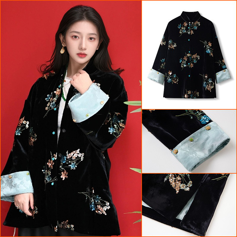 2025新型国風デザイン感コート女性冬新中国式重工スパンコール刺繍流行綿服M8117