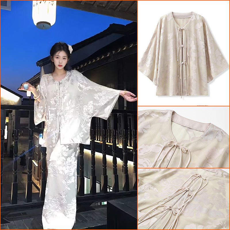 人気の新中国風花柄プリントの蝶結び付きレーヨンシャツと軽やかな高級感のあるゆったりとしたロングパンツのセット ZXモデルM5071