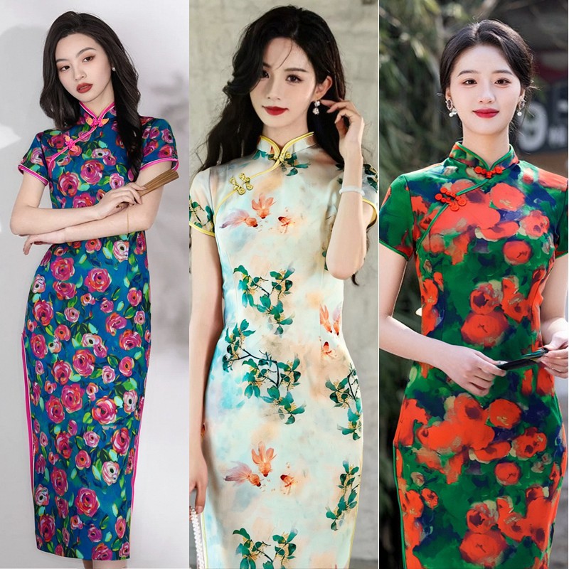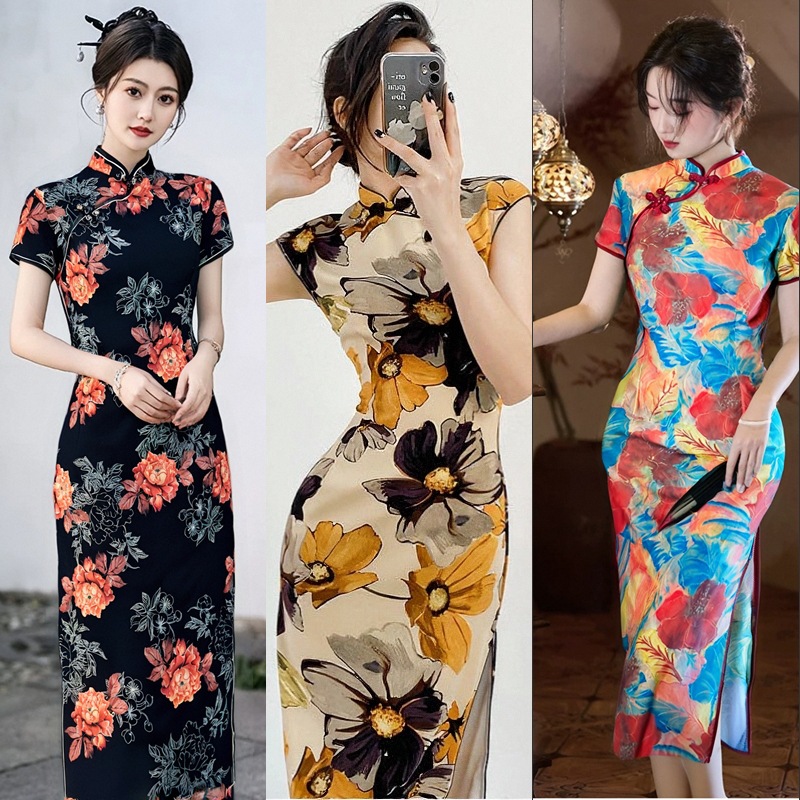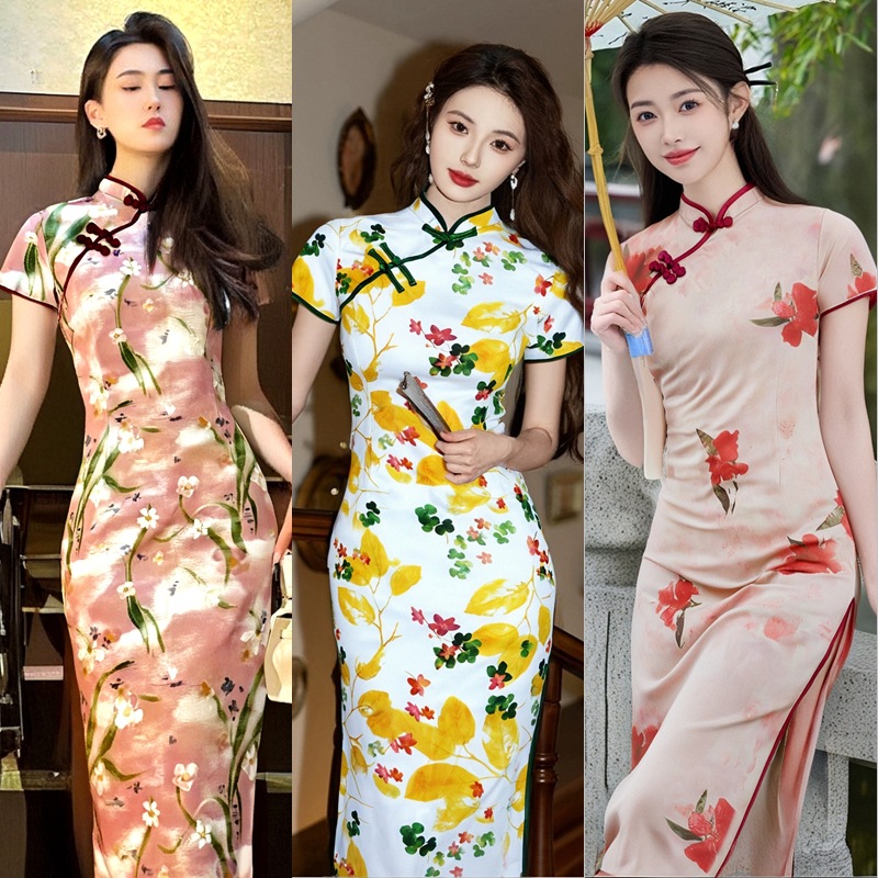 夏用半袖ロング旗袍改良版旗袍女性用2021年新作中国風レトロプリント旗袍中国風ワンピース