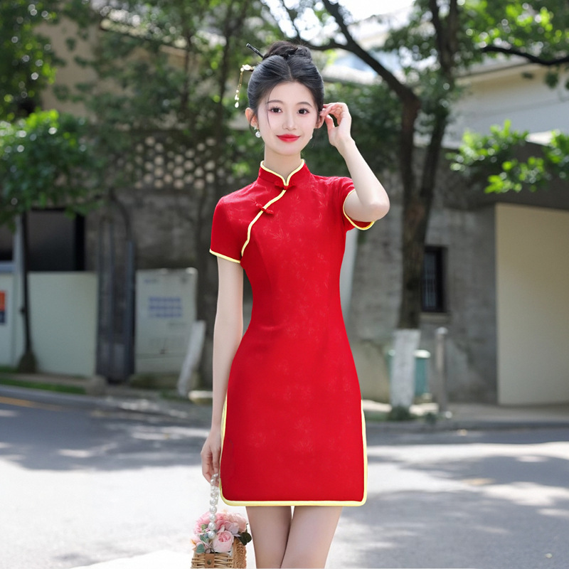 新中式红色压花旗袍改良年轻款少女2025新款夏季文艺复古日常可穿