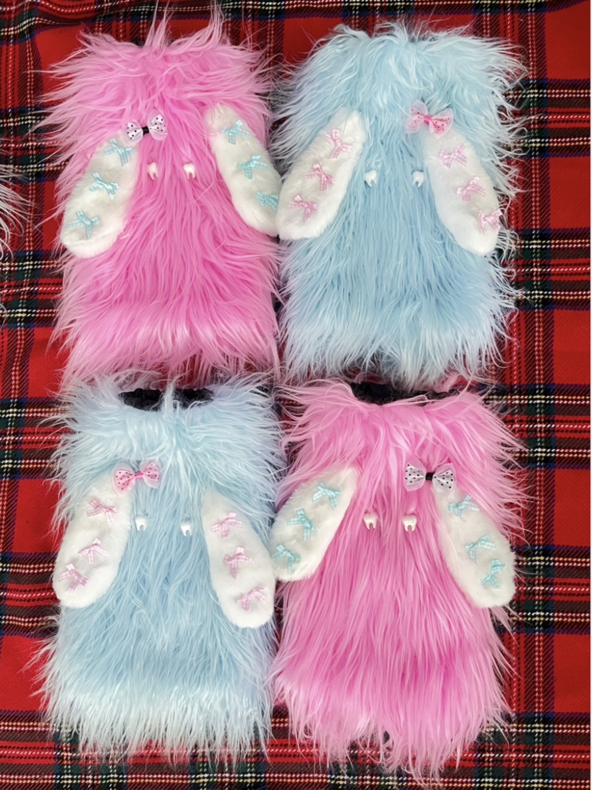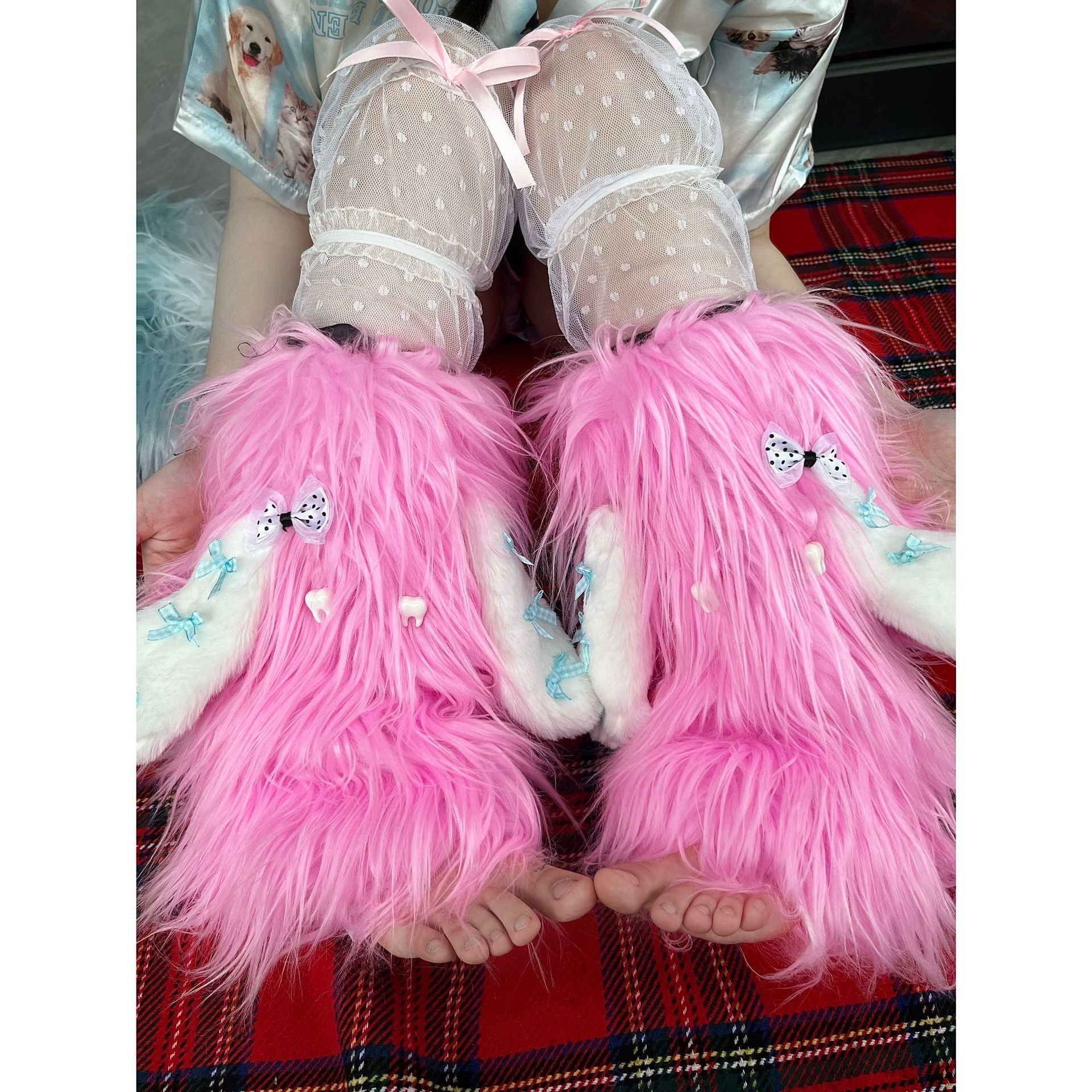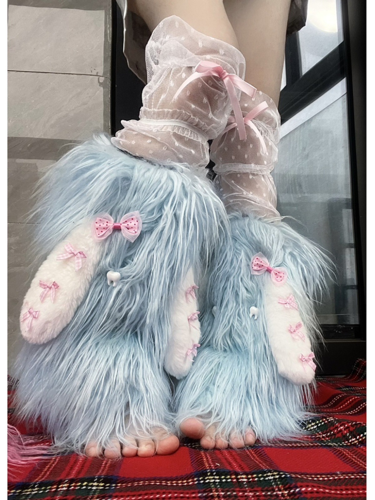 オリジナルデザインの青い巻き毛の長い耳の蝶結びの雪怪亜文化y 2kの長い毛の2色の足のカバーの靴下