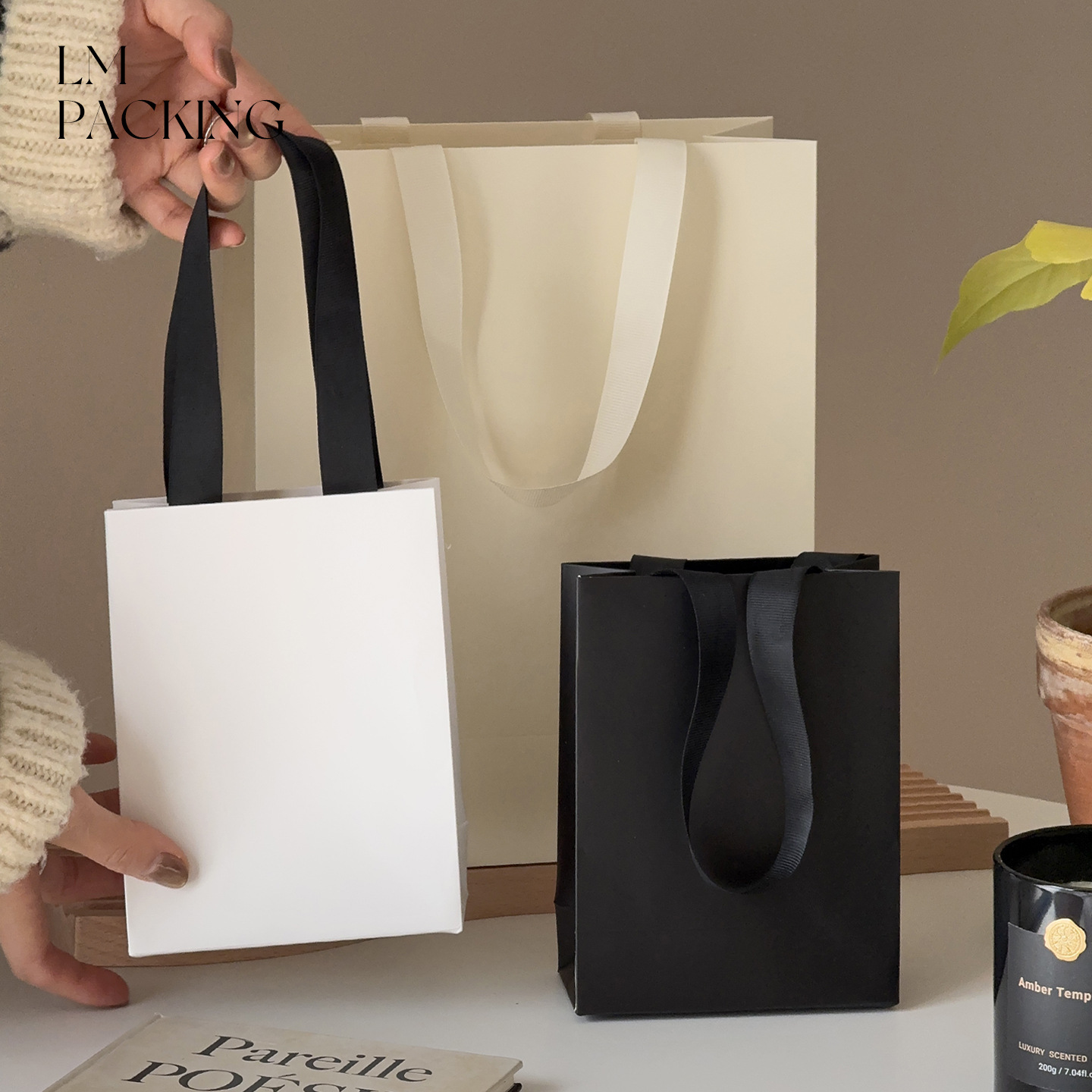 ギフト包装袋白い香風手提げ紙袋ジュエリーアクセサリーお土産袋現物印刷可能広告ロゴ