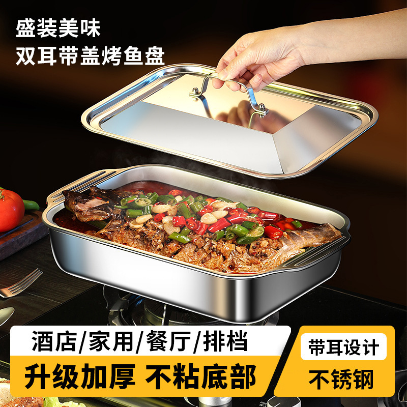 焼き魚ストーブステンレス商用深み焼き皿厚さ長方形魚皿蓋付き海鮮皿付き両耳皿