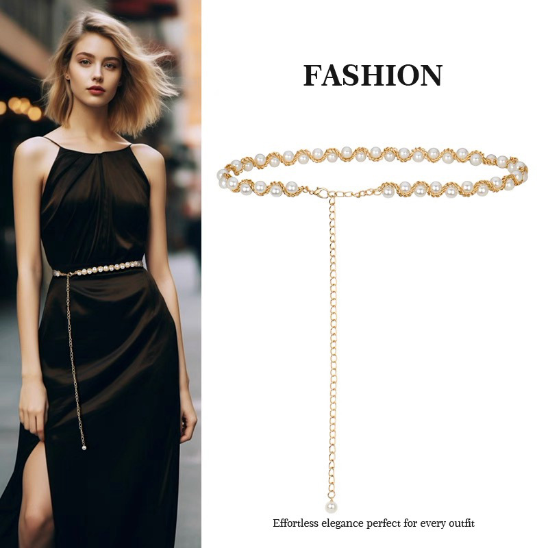 クロスボーダー女性用メタルウエストチェーン、ファッショナブルでエレガントで多用途なパールアルミチェーン、ベルト付きのハイエンドドレス
