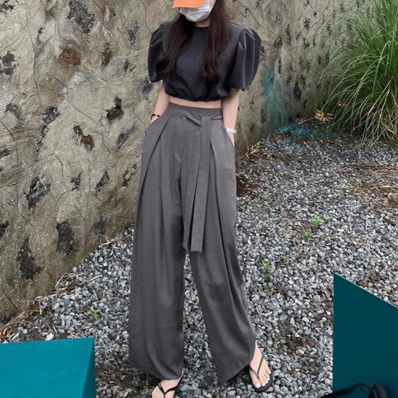 山本風高腰ひもワイドパンツ女2024韓国版薄い灰色百合ズボン夏のゆったりとした感じのズボン