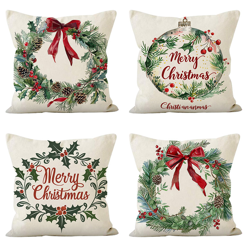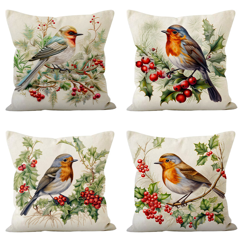 新型小鳥抱き枕カバー亜麻クリスマス葉紅果プリント枕カバークロスボーダー家庭祝日ソファークッションカバー